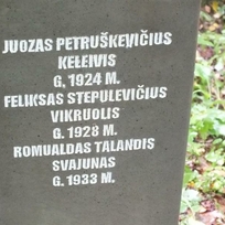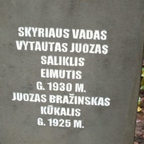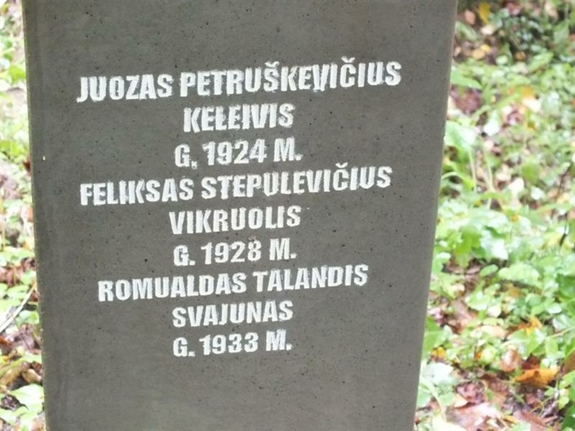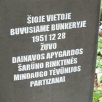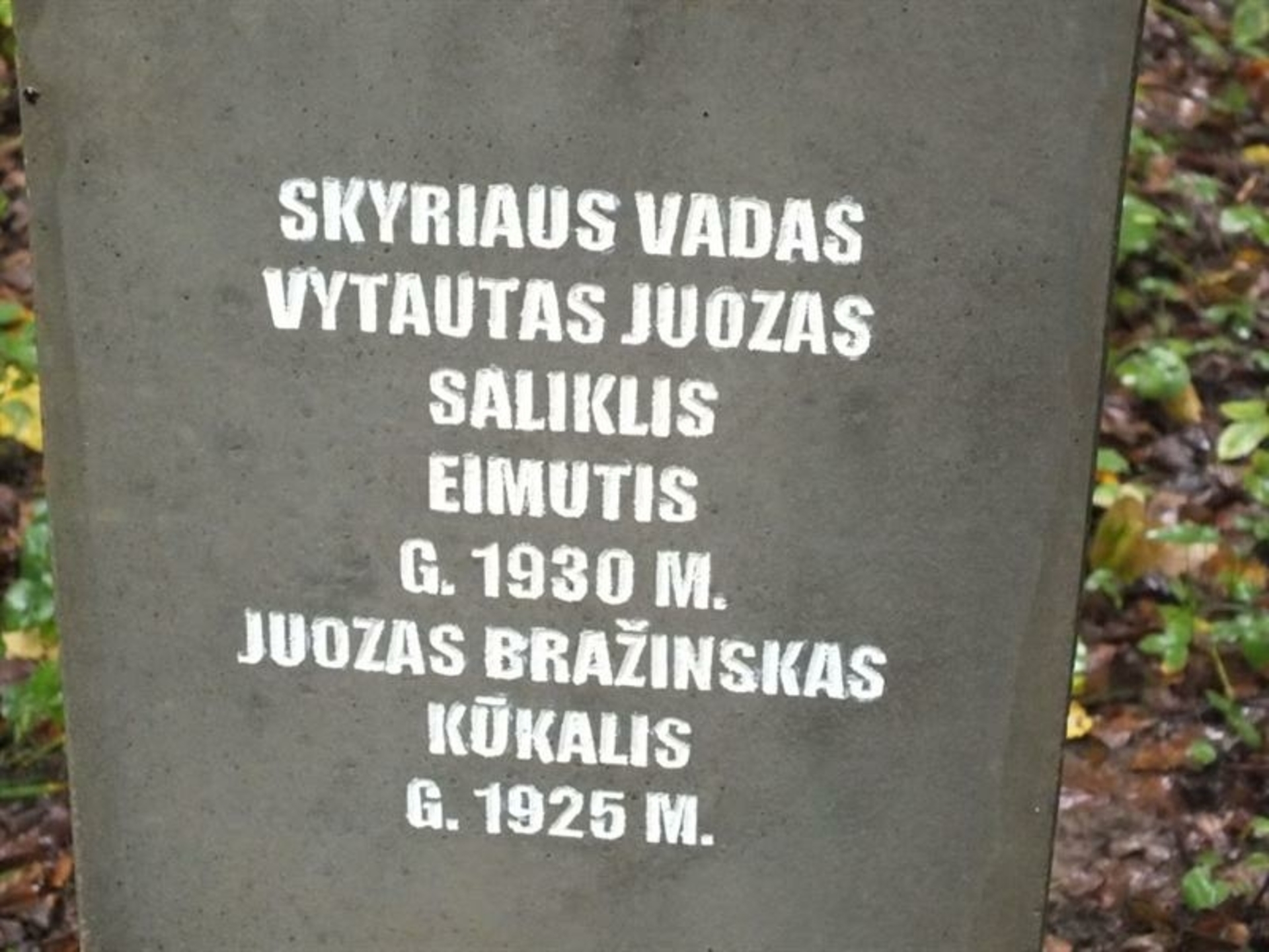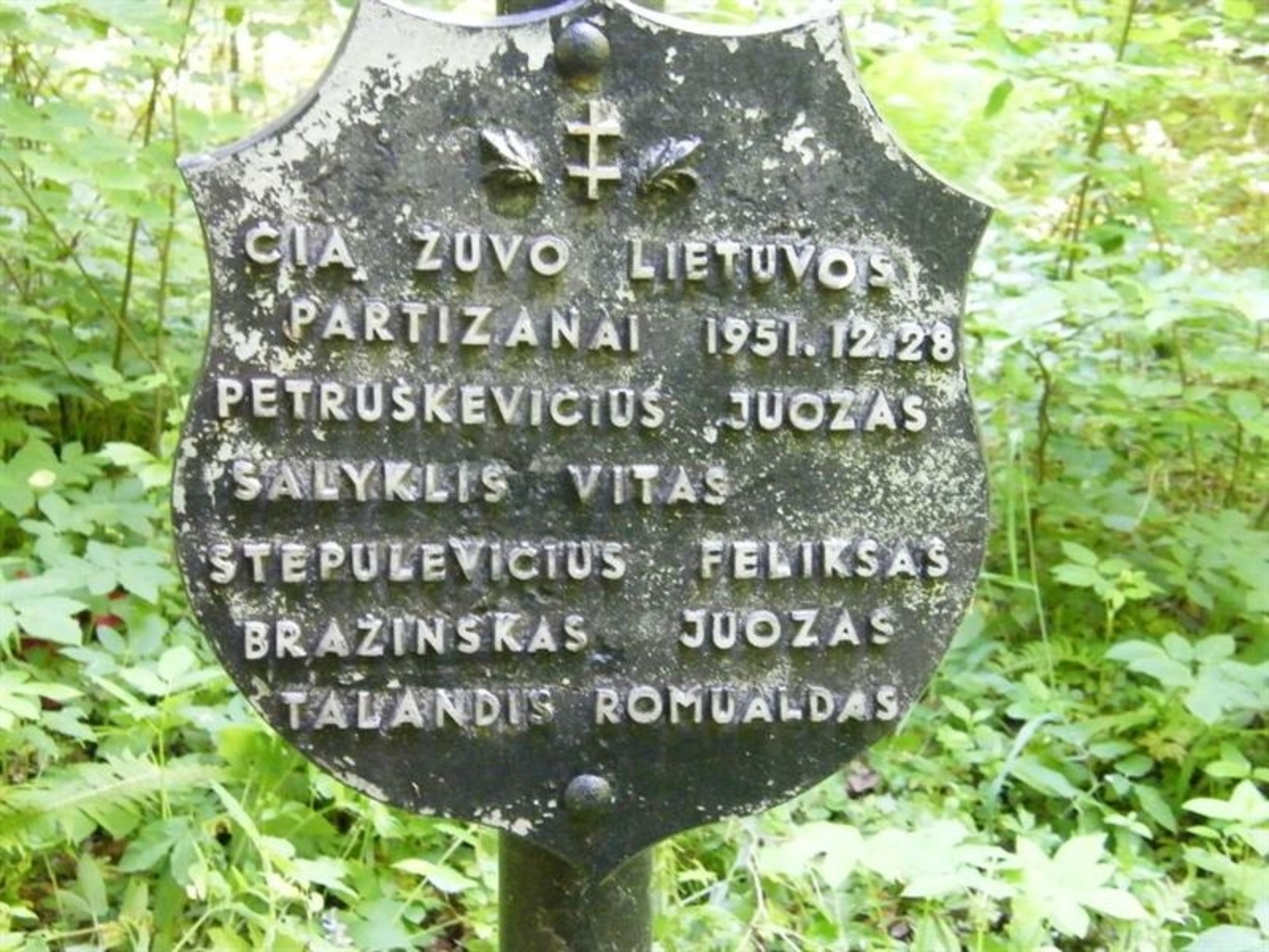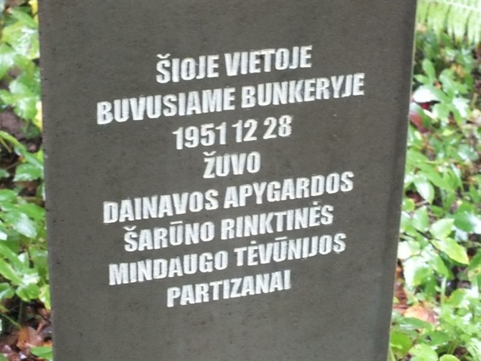 In diesem Versteck-Bunker, tupf. Am 28.12.1951 wurden im Kampf mit der umzingelten tschekistischen NKWD-Armeeeinheit im Dorf Teizų, Bezirk Lazdijų, fünf Partisanen des Mindaugas-Erbes des Bezirks Šarūnas des Bezirks Dainava getötet: Zugführer (Abteilung?) Vytautas Juozas Saliklis -Eimutis, g. 1930 (1927?) Dorf Staidaru, Klecks. Bezirk Lazdiju, Juozas Bražinskas-Kūkalis, g. Dorf Ežerėlii, Klecks. Bezirk Lazdija, Juozas Petruškevičius-Keleivis, g. im Jahr 1924 Dorf Staidaru, Feliksas Stepulevičius-Vikruolis, st. 1928 (1930?) Dorf Laibagalii, Büro Bezirk Lazdija, Romualdas Talandis-Svajūnas, g. im Jahr 1933 Dorf Giraitėlių, Büro Bezirk Lazdija Hinweis: Im Jahr der Wiedergeburt errichteten die Angehörigen und Kameraden der Partisanen in der Nähe des Bunkers des ehemaligen Verstecks ein Kreuz: An dessen Mast ist im unteren Teil eine metallene, schildförmige Platte befestigt, auf der das Schild eingegossen ist des Vytis-Kreuzes und die Inschrift: „DIE LEUTNANTS STARBEN HIER / PARTISANS 1951.12.28 / PETRUSKEVIČIUS JUOZAS / SALYKLIS VITAS / STEPULEVIČIUS FELIKS / BRAŽINSKAS JUOZAS / TALANDIS ROMUALDAS“ (Anhänge 1, 4)