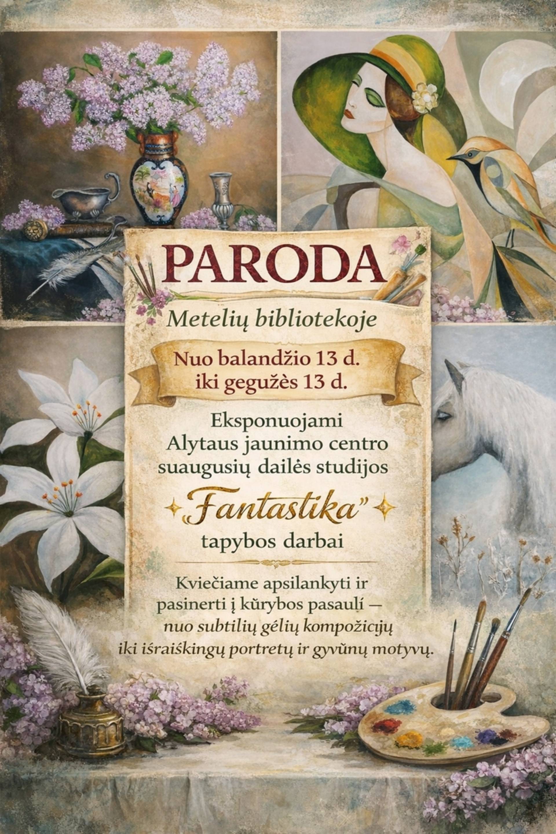 Ausstellung von Gemälden des Erwachsenenkunststudios "Fantastika" des Alytus Jugendzentrums.
