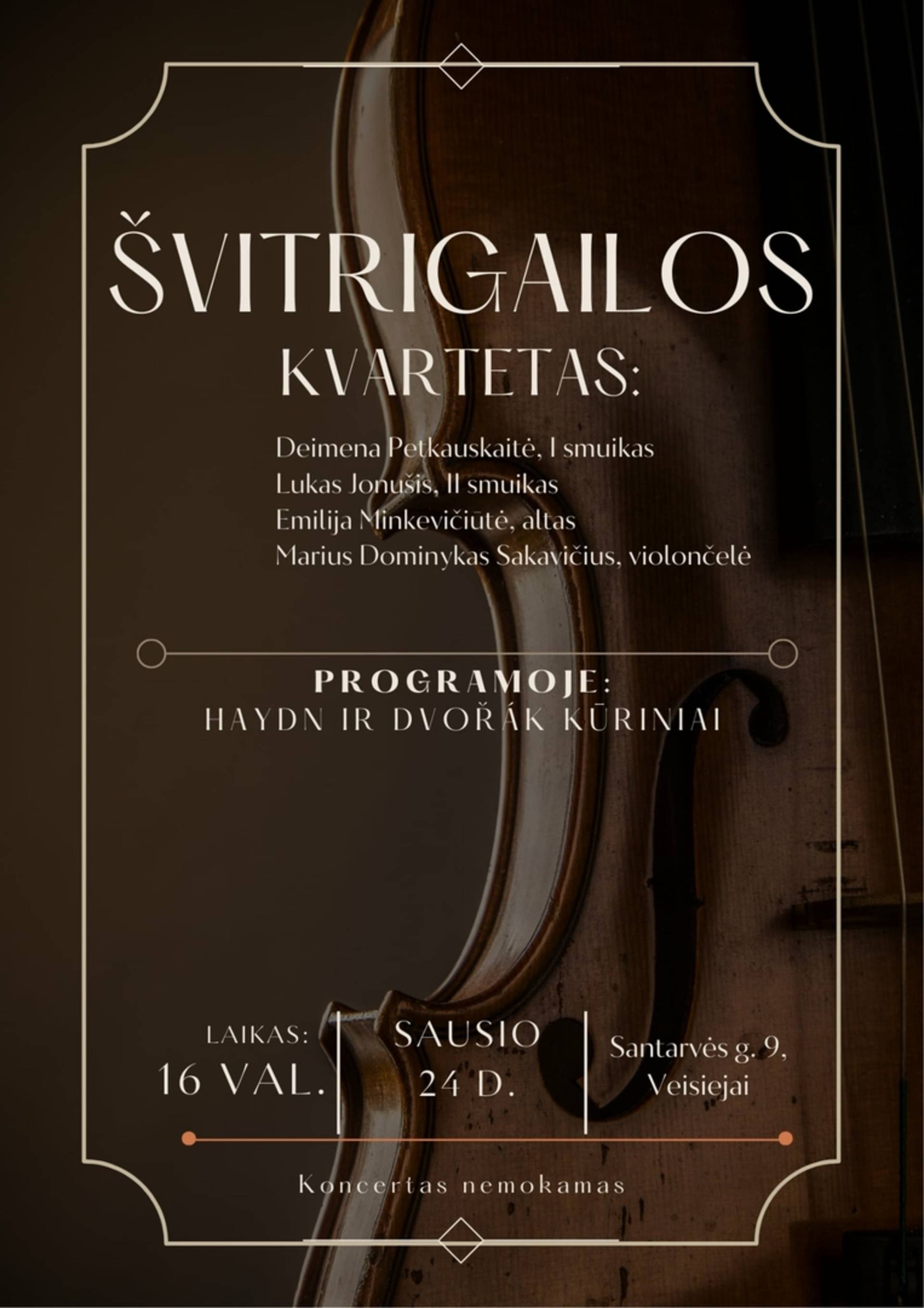 Wir laden Sie herzlich ein, am 24. Januar um 16:00 Uhr im Veranstaltungssaal des Besucherzentrums des Regionalparks Veisiejai ihrer Musik zu lauschen! Auf dem Programm stehen Werke von J. Haydn und A. Dvořák.