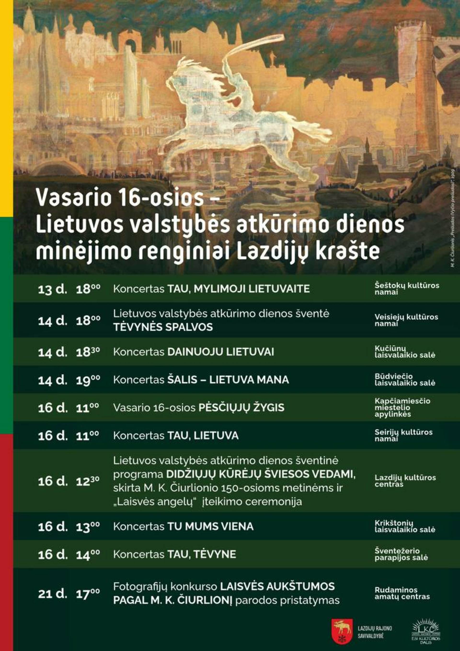 Der 16. Februar ist der TAG DER WIEDERHERSTELLUNG DES LITAUISCHEN STAATES in der Region Lazdijai. Wir laden Bewohner und Gäste des Bezirks ein, an unseren Veranstaltungen teilzunehmen und gemeinsam den Tag der Wiederherstellung des Staates zu feiern!