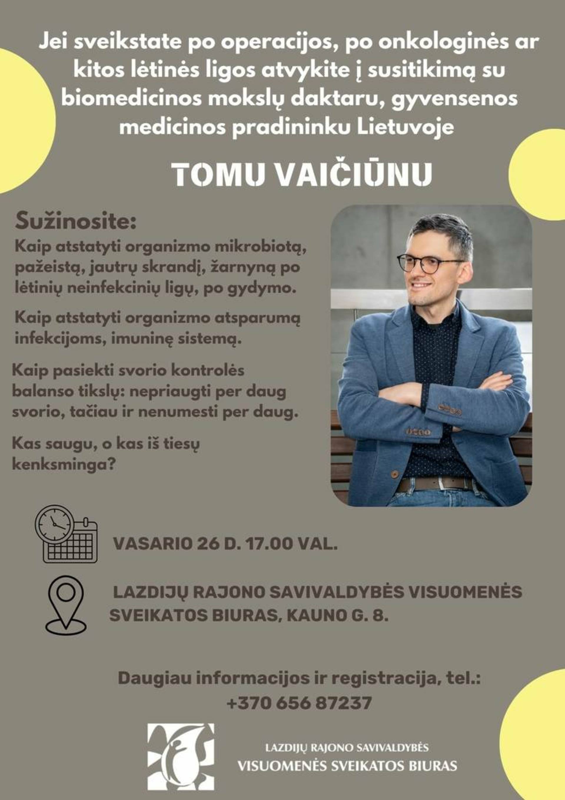 Wir laden Sie zu einem Treffen mit dem Lifestyle-Medizin-Experten Tomas Vaičiūnas ein. Dieses Mal erfahren Sie etwas über die Besonderheiten der Ernährung und Lebensführung für Menschen, die sich von einer Operation, einer onkologischen Erkrankung oder einer chronischen Krankheit erholen. Wir werden warten!!!