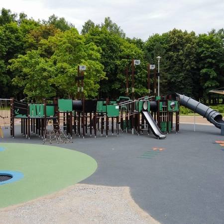 Kinder haben die Möglichkeit, in verschiedenen Spielanlagen mit Klettergerüsten und Rutschen zu spielen, sich an einfachen Schaukeln, Balance- und Federschaukeln zu erfreuen, auf geerdeten Trampolinen zu springen, barfuß auf dem Kneipppfad zu trainieren, auf einer vertieften Rampe Rollerblades oder Skateboards zu fahren oder zu balancieren und einfach zu balancieren Fahrräder auf einer Holzachterbahn.