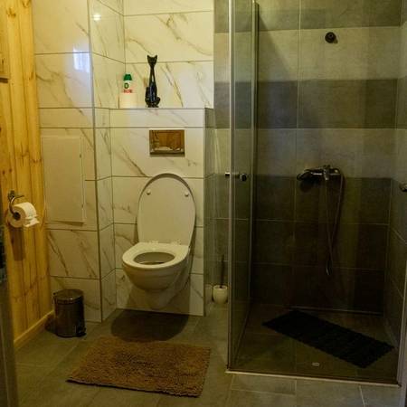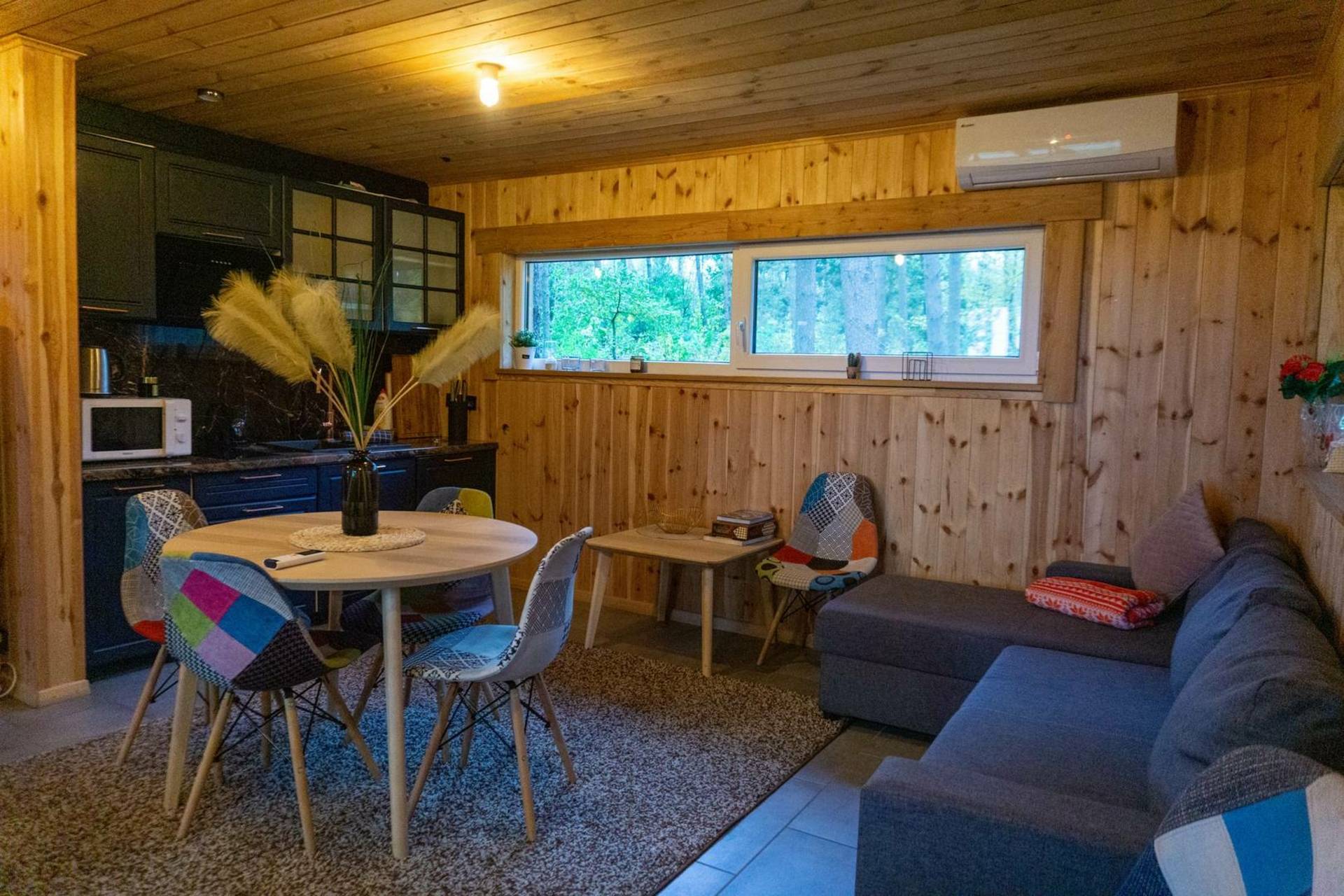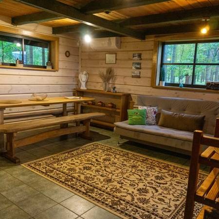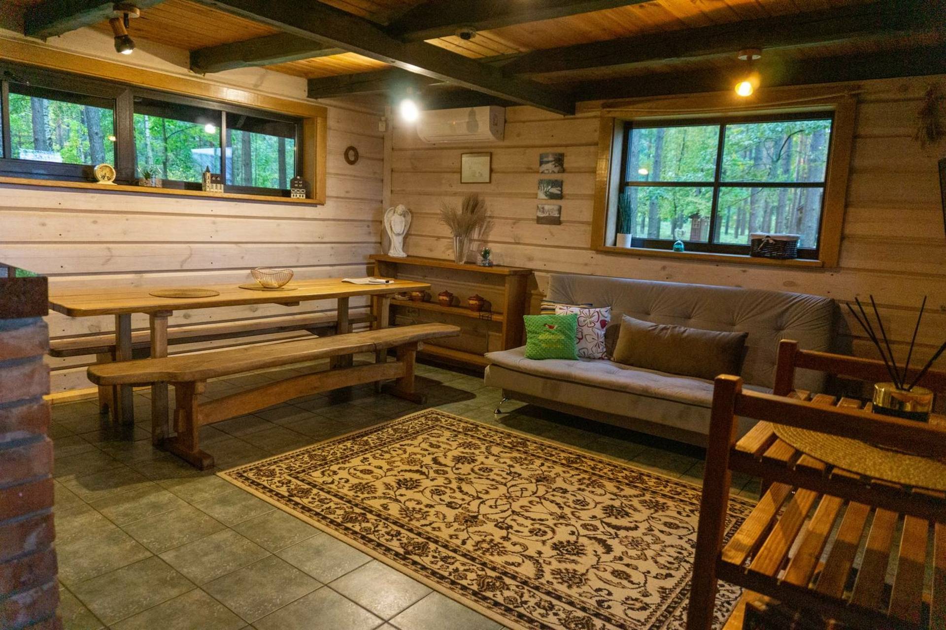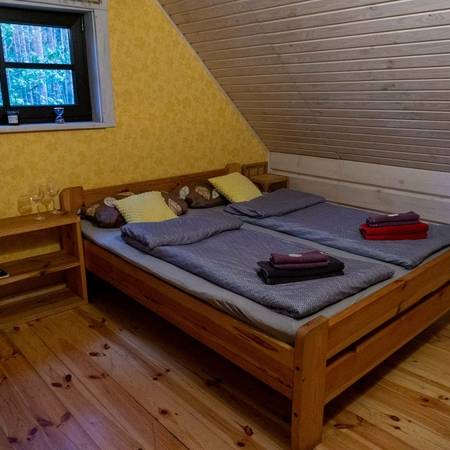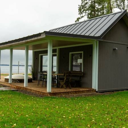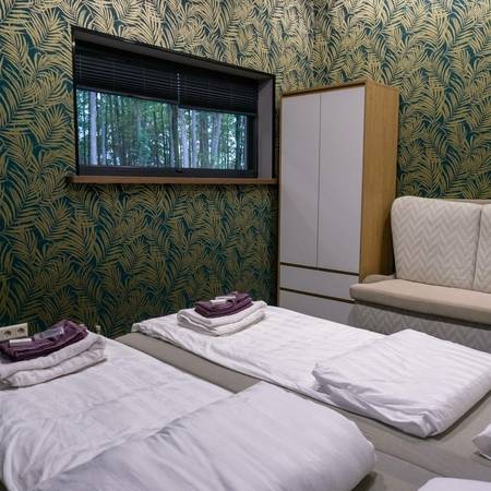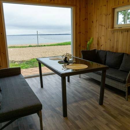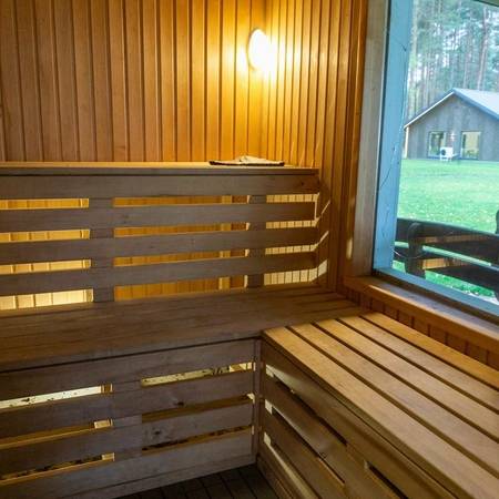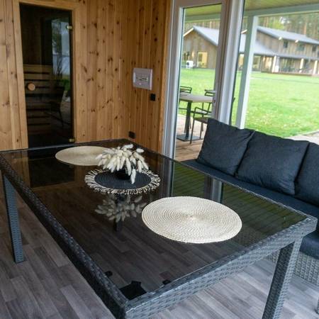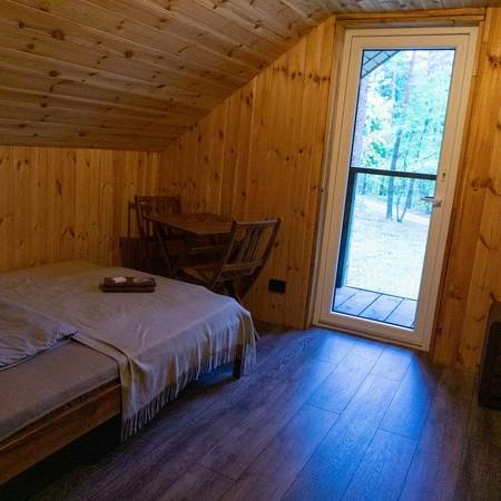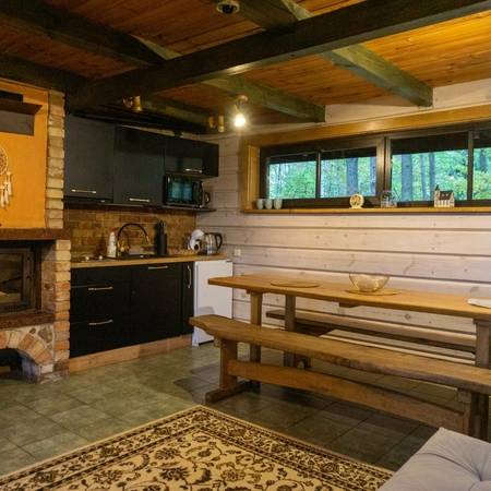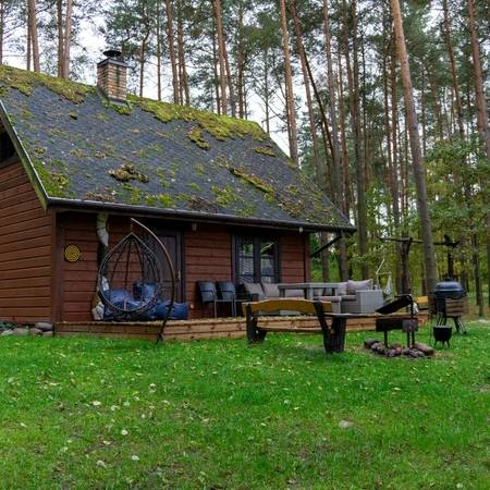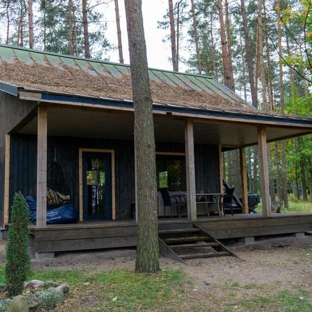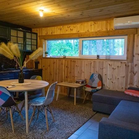 Rest houses are designed for your time in nature. Cabins accommodate up to 8 persons. Inside the cottages you will find everything you need for your cozy rest: a kitchen with household appliances and kitchen utensils, a rest area, a dining area, a bathroom, 2 bedrooms, a spacious outdoor terrace with outdoor furniture and a barbecue, and a children's playground.