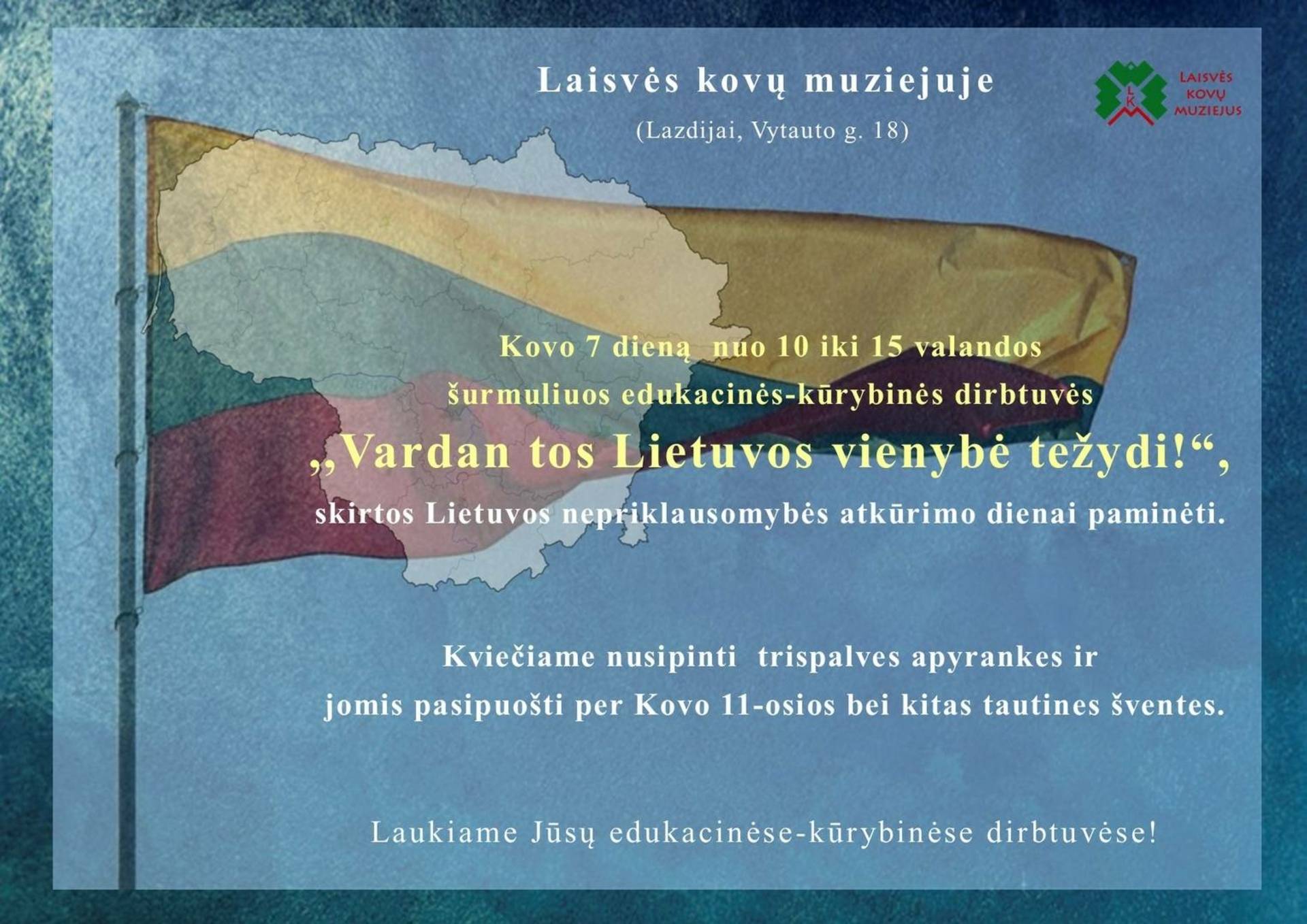 We all want to dress up in national attributes during national holidays, because we are happy about freedom and the fact that we are Lithuanians! Therefore, on March 7, from 10 am to 3 pm, we invite you to participate in the educational and creative workshop "For the sake of that Lithuanian unity, may it bloom!" at the museum. You will have a great opportunity to weave tricolor bracelets using the macrame technique.