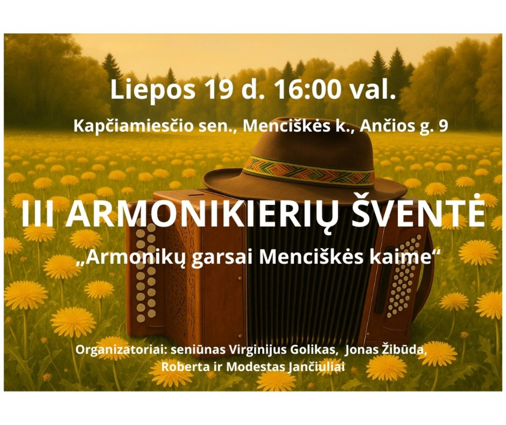 July 19th. 4:00 PM. Kapčiamiestis sen., Menciškės village, Ančios st. 9 III HARMONIKERS' FESTIVAL "Sounds of harmonicas in Menciškės village".