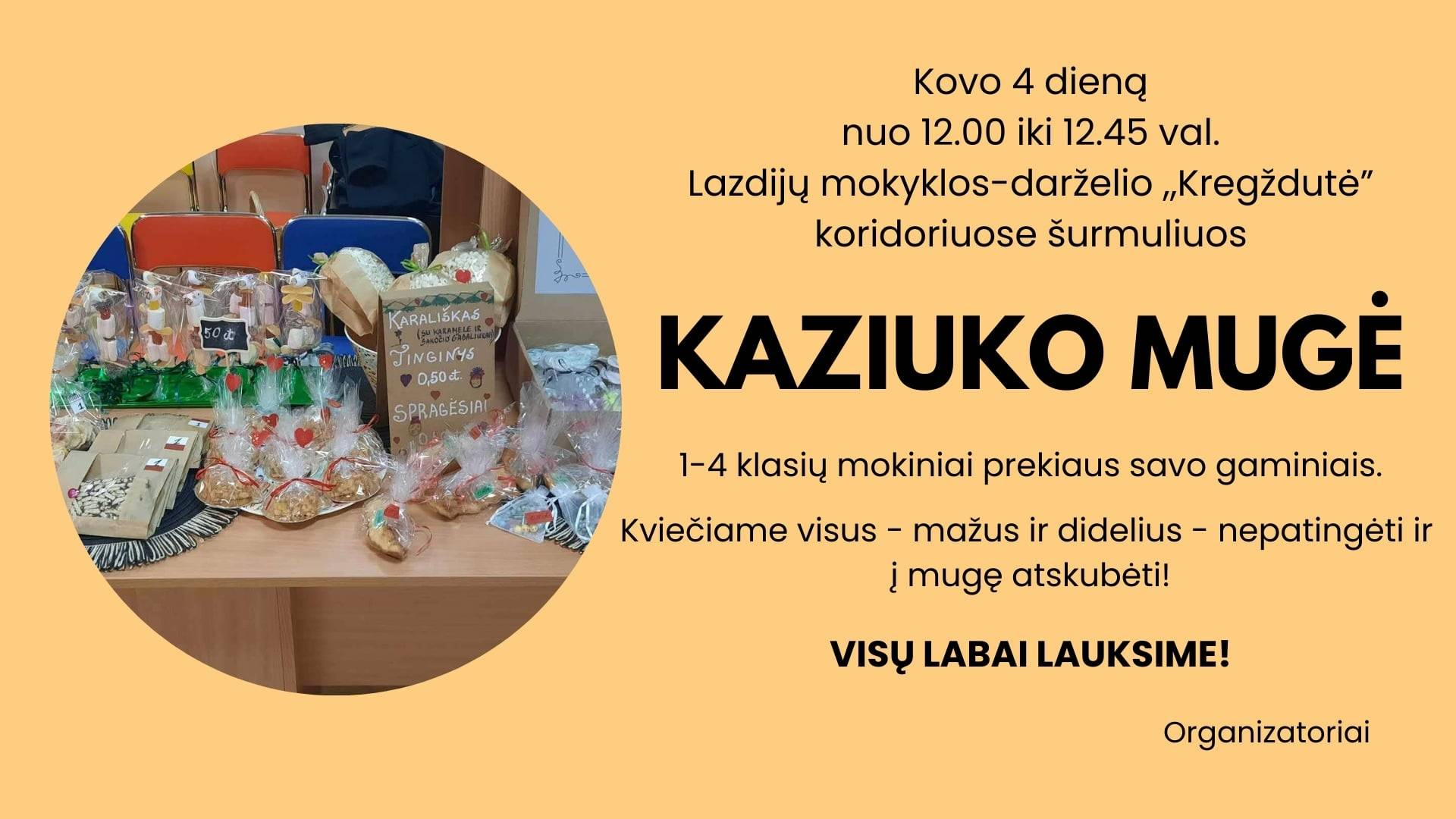 On March 4th, from 12:00 to 12:45, the corridors of the Lazdijai School-Kindergarten "Kregždutė" will host a KAZIUKO FAIR, where students from grades 1-4 will sell their products.