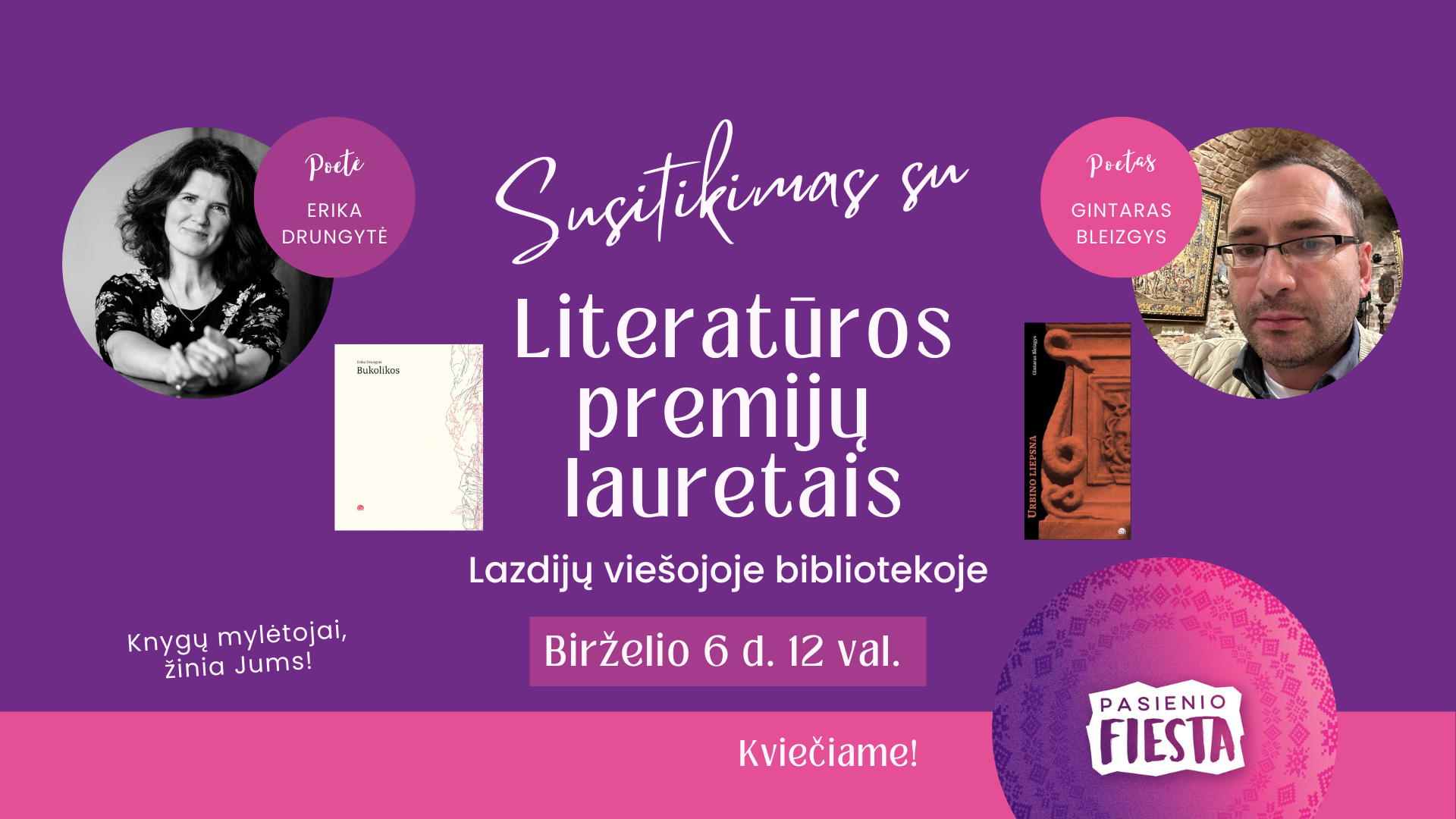 June 6 at 12:00 PM to a meeting with Gintaras Bleizgis and Erika Drungytes and the presentation of their latest poetry books "Urbino liepsna" and "Bukolikos" in the Conference Hall of the Lazdijai Public Library.