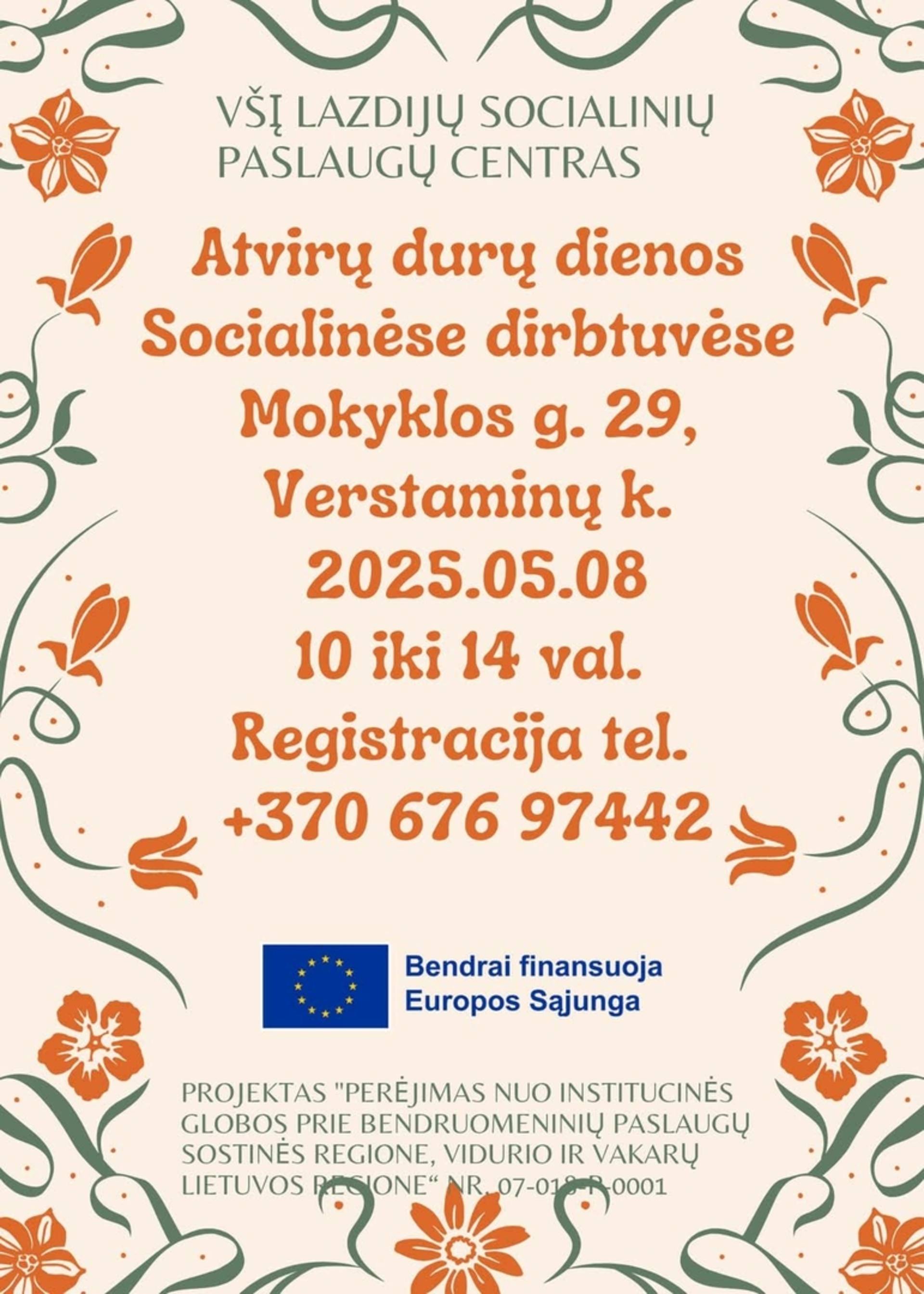 Open days at social workshops. Mokyklos st. 29, Verstaminai, Lazdijai district. Registration tel. +37067697442.