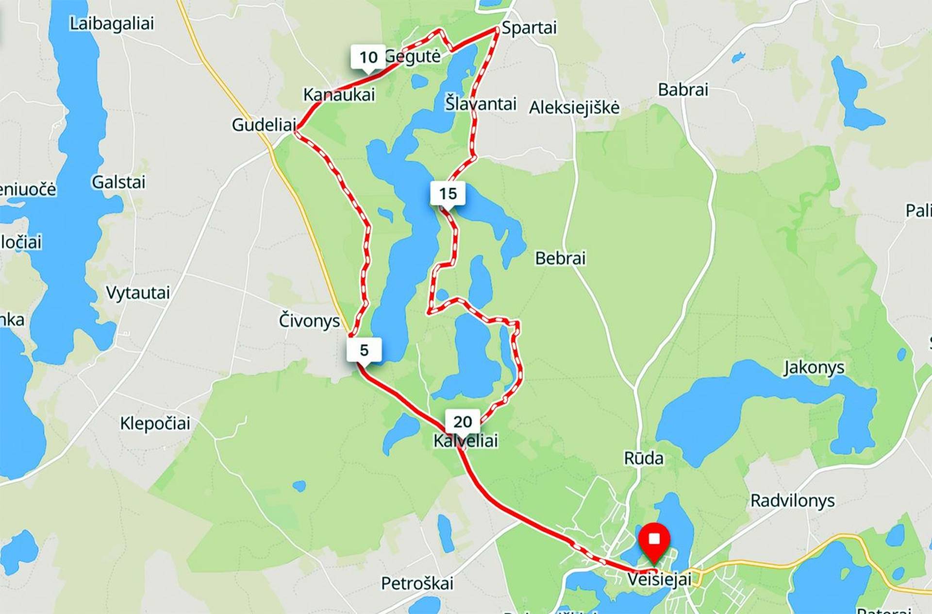 Maršrutas prasideda Veisiejuose ir veda pro Kalvelių kaimą, Liūnelio ežerą, Šlavantėlio ir Giluišio tarpuežerį, Ešerinėlio ir Bliūdelio ežerus, Balsio ir Šlavanto tarpuežerį iki Šlavantų kaimo, kuriame jus pasitiks įspūdinga Šlavantų kraštovaizdžio draustinio panorama. Toliau keliaujama pro Gegutės kaimą, Šlavantų Viešpaties apreiškimo Švč. Mergelei Marijai bažnyčią iki Šlavantų piliakalnio su senovės gyvenviete. Pro Kanaukų kaimą, Liubelio mišką ir Čivonių bei Kalvelių kaimus grįžtama į Veisiejus.