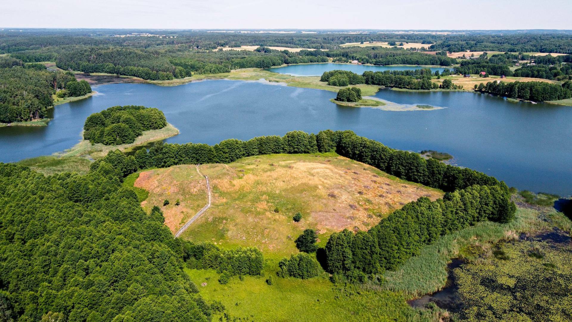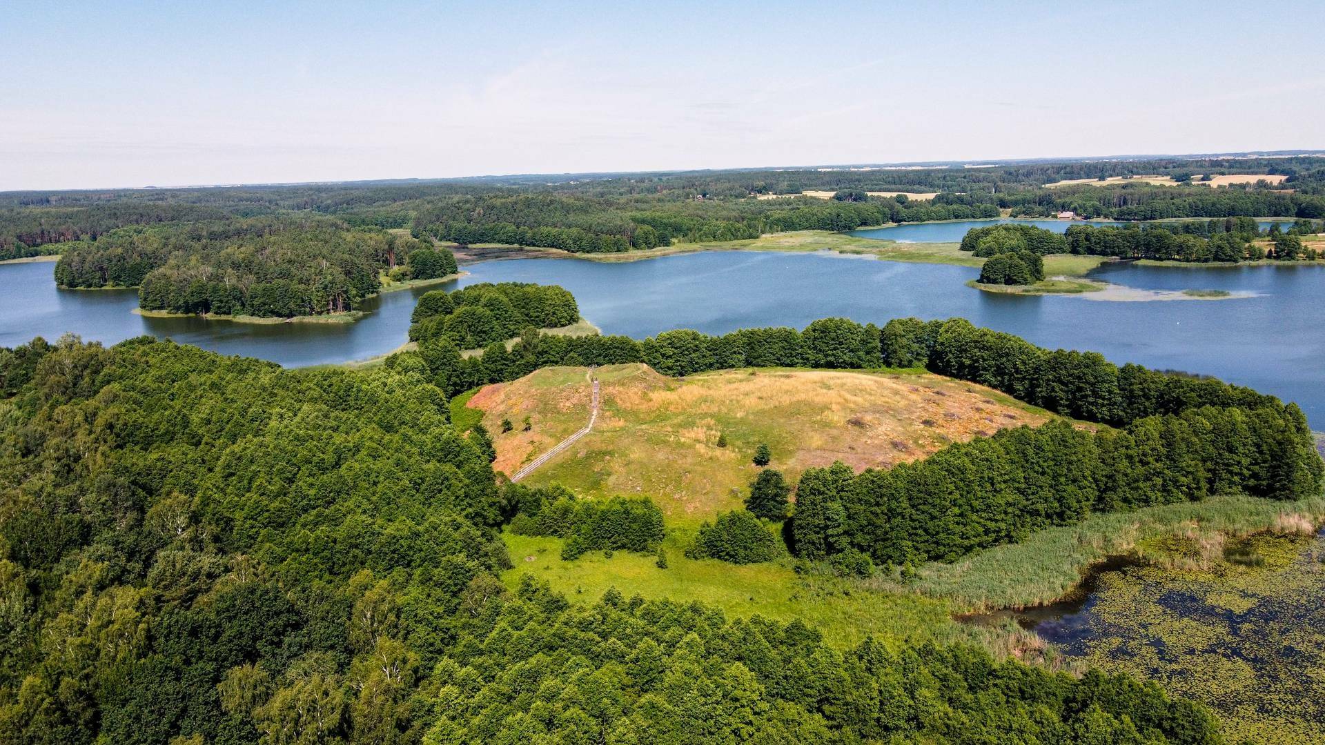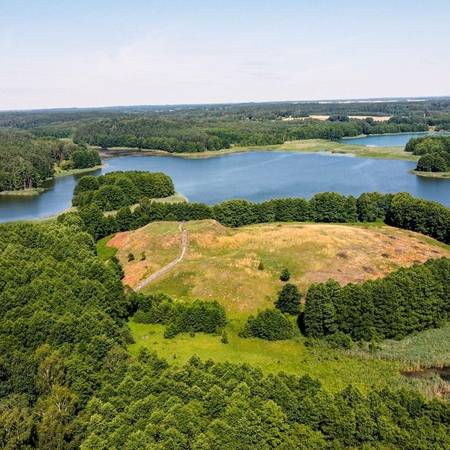 Paveisininkai mound was built after using the southwestern edge of the hill on the southern shore of Lake Veisiej. Above, there is an oval, elongated in the east-west direction, a 30x24 m site (former castle courtyard), surrounded by a 1-3 m high, 8-16 m wide defensive embankment. In its northern part, there is a depression 1-1.5 m deep - the place of the old entrance. In the east, the outer 4-5 m high slope of the embankment descends to a 7 m wide terrace, behind which a 9 m wide, 1.2 m deep ditch is excavated. On the western side, 5 m below the embankment, there is a 4 m wide terrace, and 4 m below it, a second 10 m long, 15 m wide terrace. There was a 1.5 ha settlement at the eastern-northeastern foot of the mound.