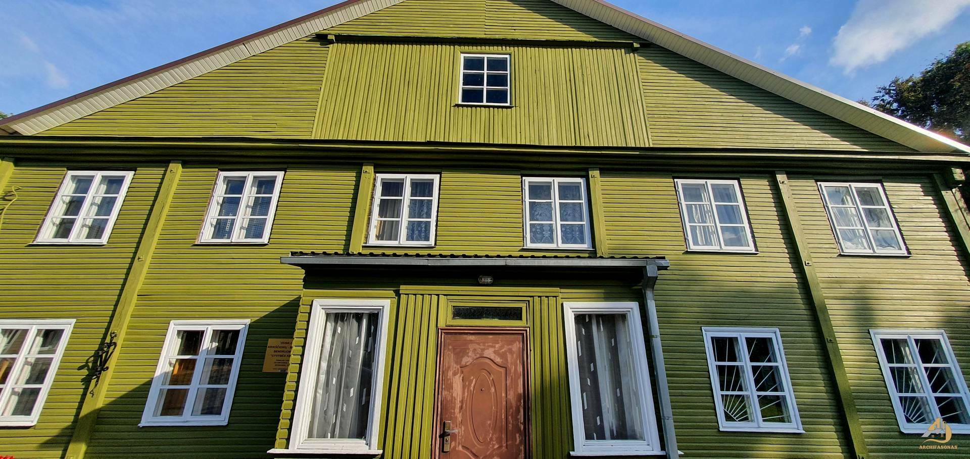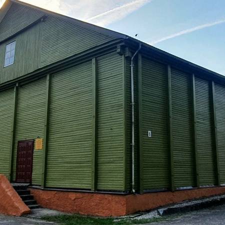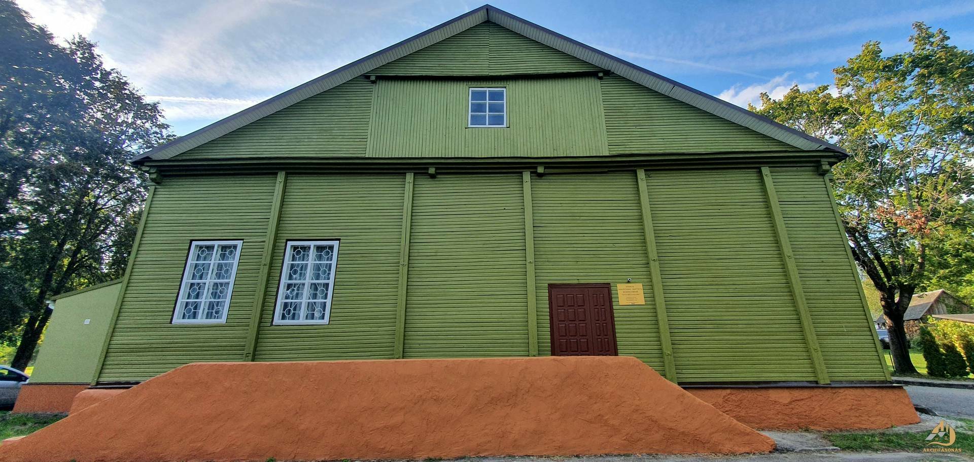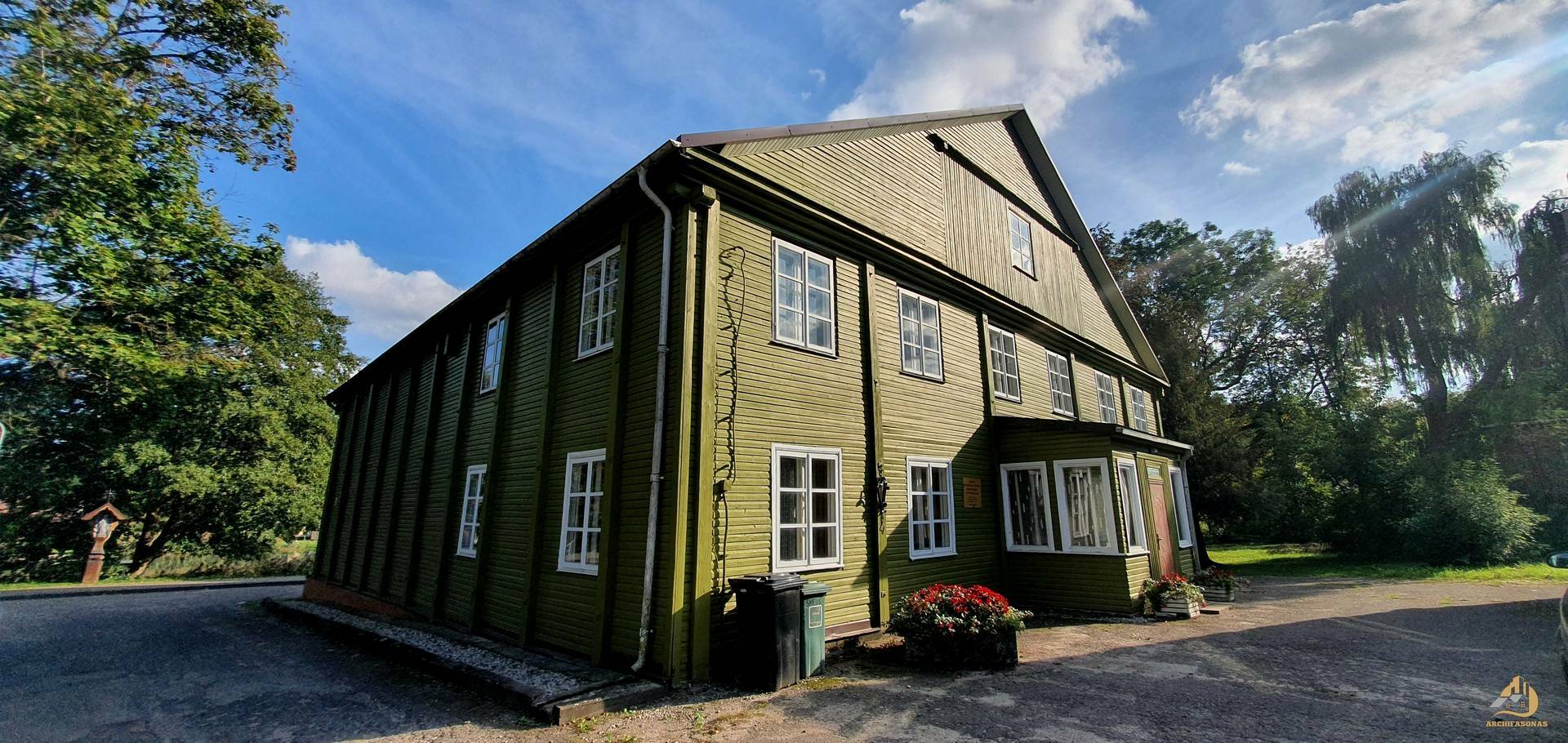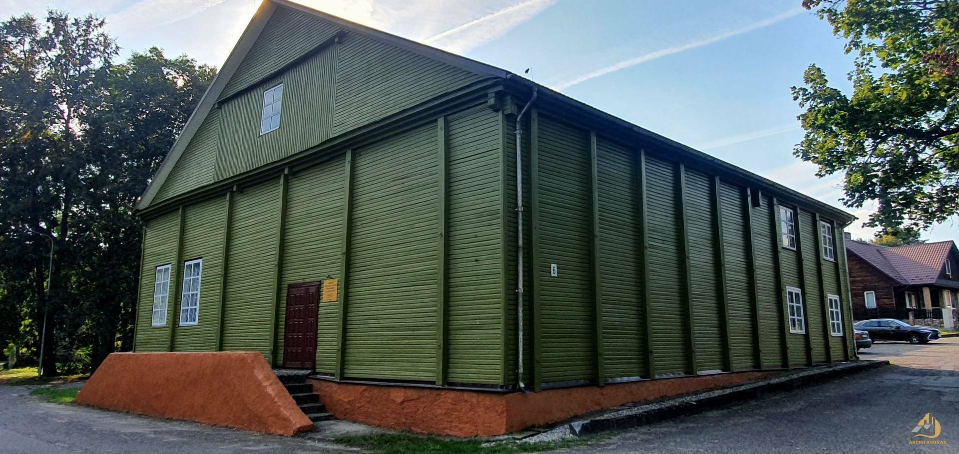in 1748 with the first synagogue in Veisiejai, the history of local synagogues began - fire after fire and one synagogue was always replaced by another in the same place. The current wooden synagogue that has survived here was built in 1927. on the shore of Lake Ančias has almost kept its original form until today. The green-painted two-story building with a veranda-like porch and 12 large windows marking part of the former worship hall is a unique memory of the once multicultural town of Veisiei. The building itself has conditionally retained its function as a house of prayer - since 2004. a Baptist church meets here.
