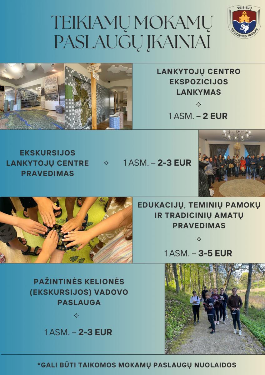 - Visiting the Veisiei Regional Park VISITORS' CENTER on its own becomes PAID, 1 person. - 2 EUR.