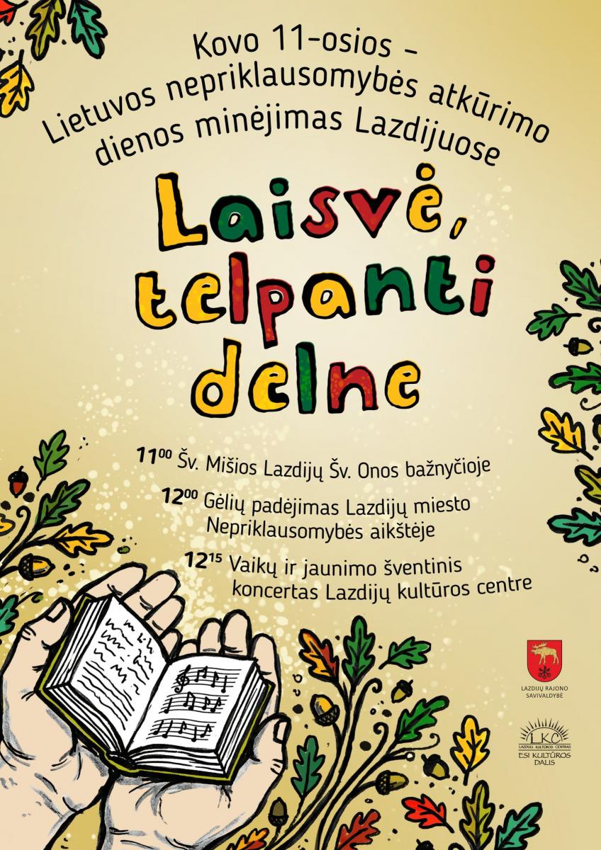 Lazdijų kultūros centre kovo 11 dieną šventės pagrindiniu akcentu taps koncertas, kuriame pasirodys jaunoji mūsų krašto karta. Jūsų lauks jautri ir prasminga meninė programa, kalbanti apie Lietuvos kelionę laisvės link.