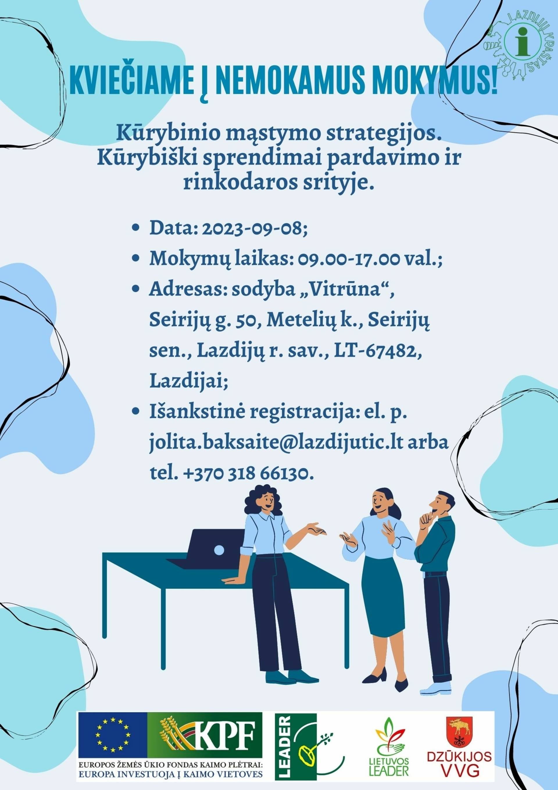 VšĮ „Lazdijų turizmo informacinis centras“ įgyvendindamas projektą „Verslo sėkmė - nuolatinis profesinis tobulėjimas“, pagal priemonę ,,Parama vietos projektų pareiškėjų ir vykdytojų mokymams konkurencingumo didinimo, įgūdžių įgijimo, inovatyvumo vystymo srityse“ organizuoja nemokamus mokymus.