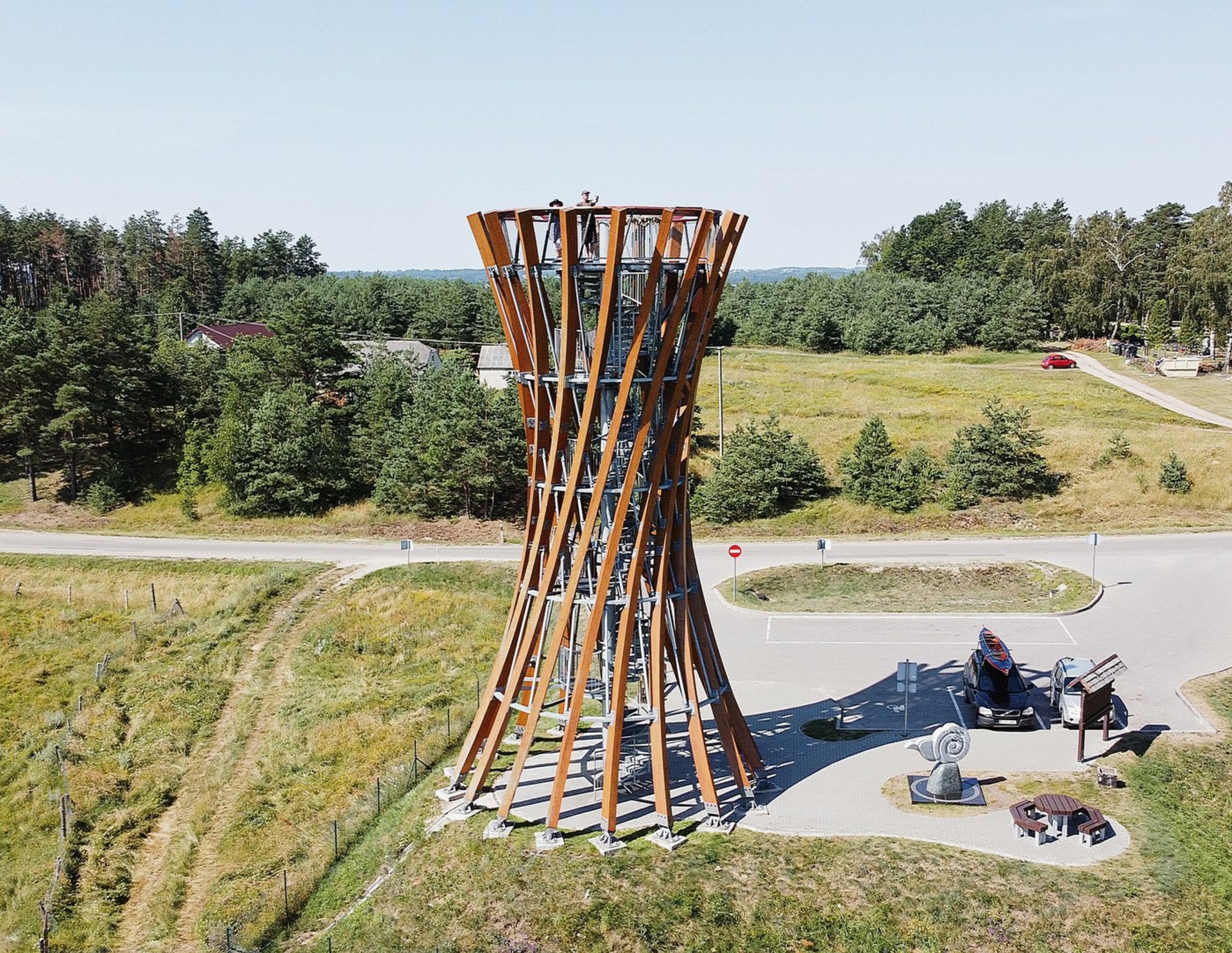 Pomiędzy jeziorami Dusia i Metelis, w południowej części miejscowości Meteliai, znajduje się 15-metrowa wieża widokowa Parku Regionalnego Meteliai, zaprojektowana przez architekta A. Gudelisa. Otaczając metalowe konstrukcje drewnianymi belkami, budynek zdołał wtopić się w cudowny krajobraz Parku Regionalnego Meteliai. Wieża widokowa o wysokości 15 metrów oferuje panoramiczny widok na jezioro Metelis, wioskę Meteliai, łąkę Kemsinė i wąski odcinek jeziora Dusia. Po drugiej stronie jeziora znajduje się kopiec Papėčiai. Z wieży wygodnie jest obserwować ptaki latające w jeziorze.
