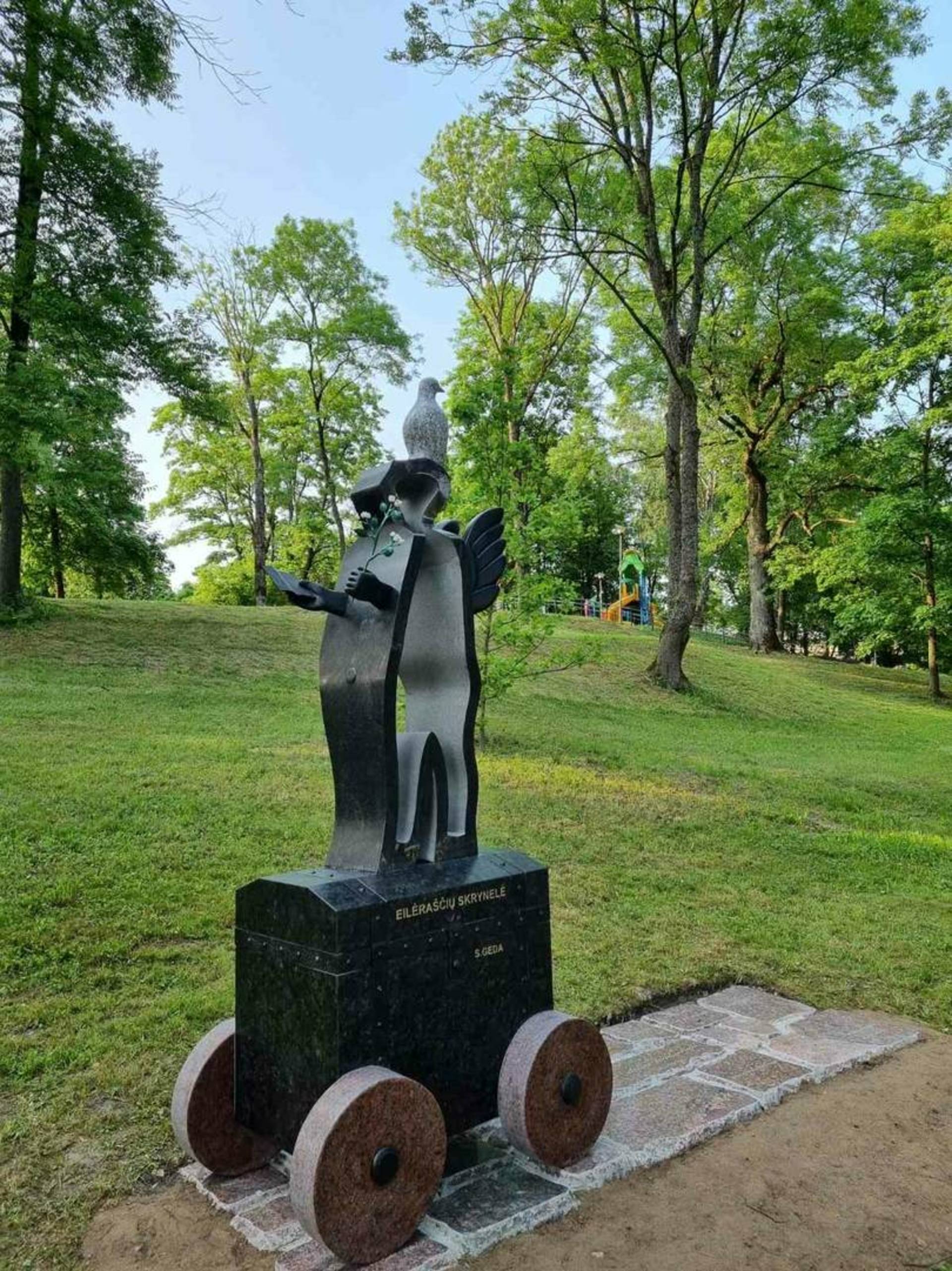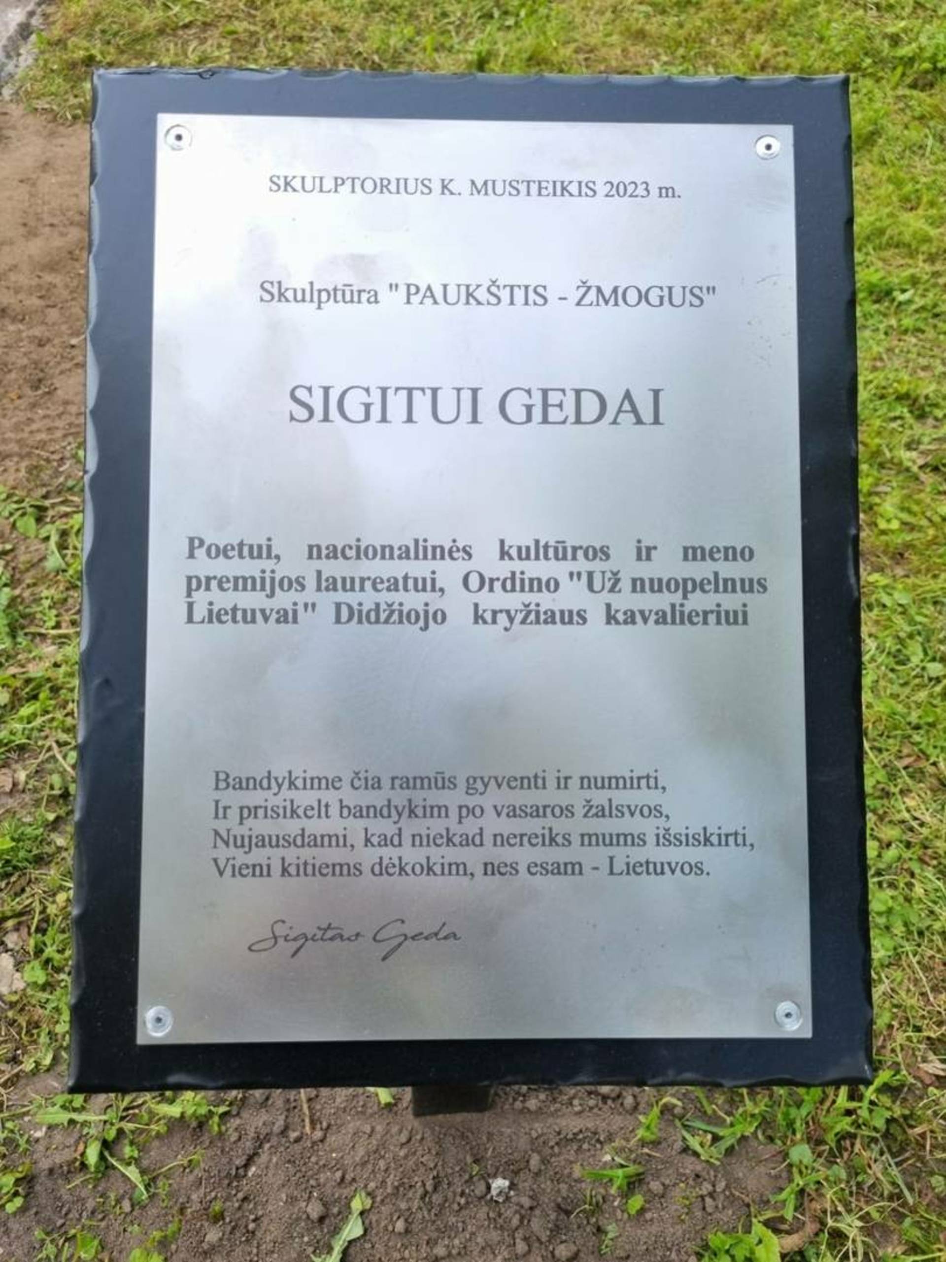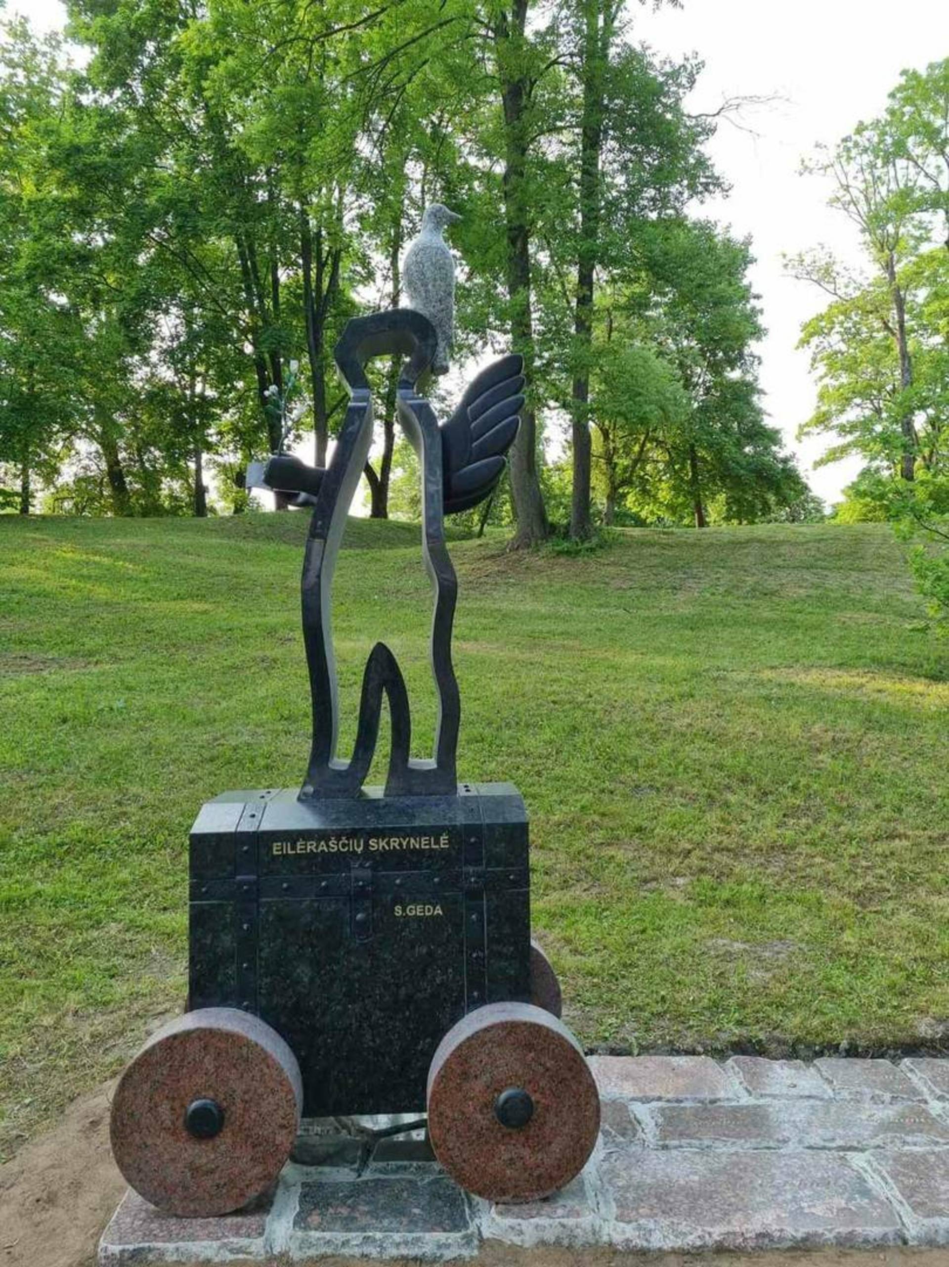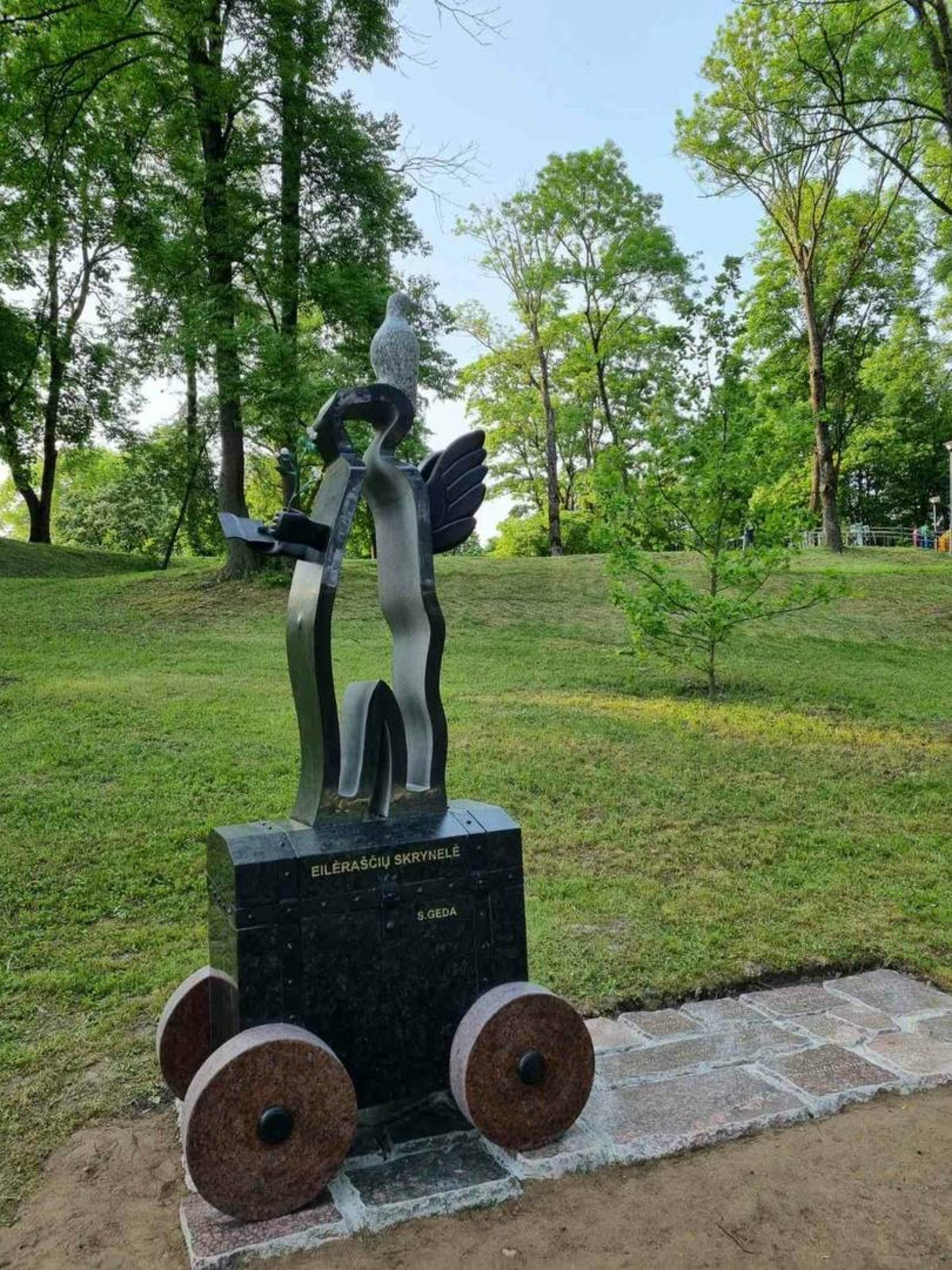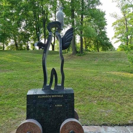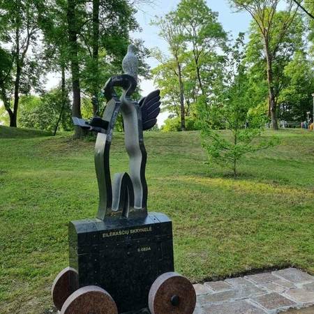 Rzeźba w Parku Wiejskim powstała w ramach realizacji projektu „Interpretacja dzieła Sigita Geda w rejonie Wiejskim”