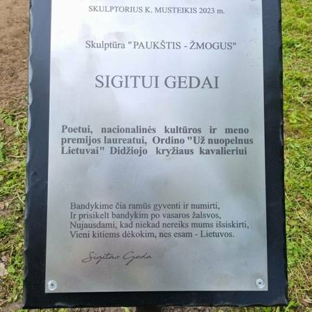 Nawiązując do twórczości Sigitasa Gedy i świętując jego 80. rocznicę urodzin, 27 maja 2023 r. w jego rodzinnym mieście Veisiei stanęła rzeźba K. Musteikisa „Ptak – Człowiek”.