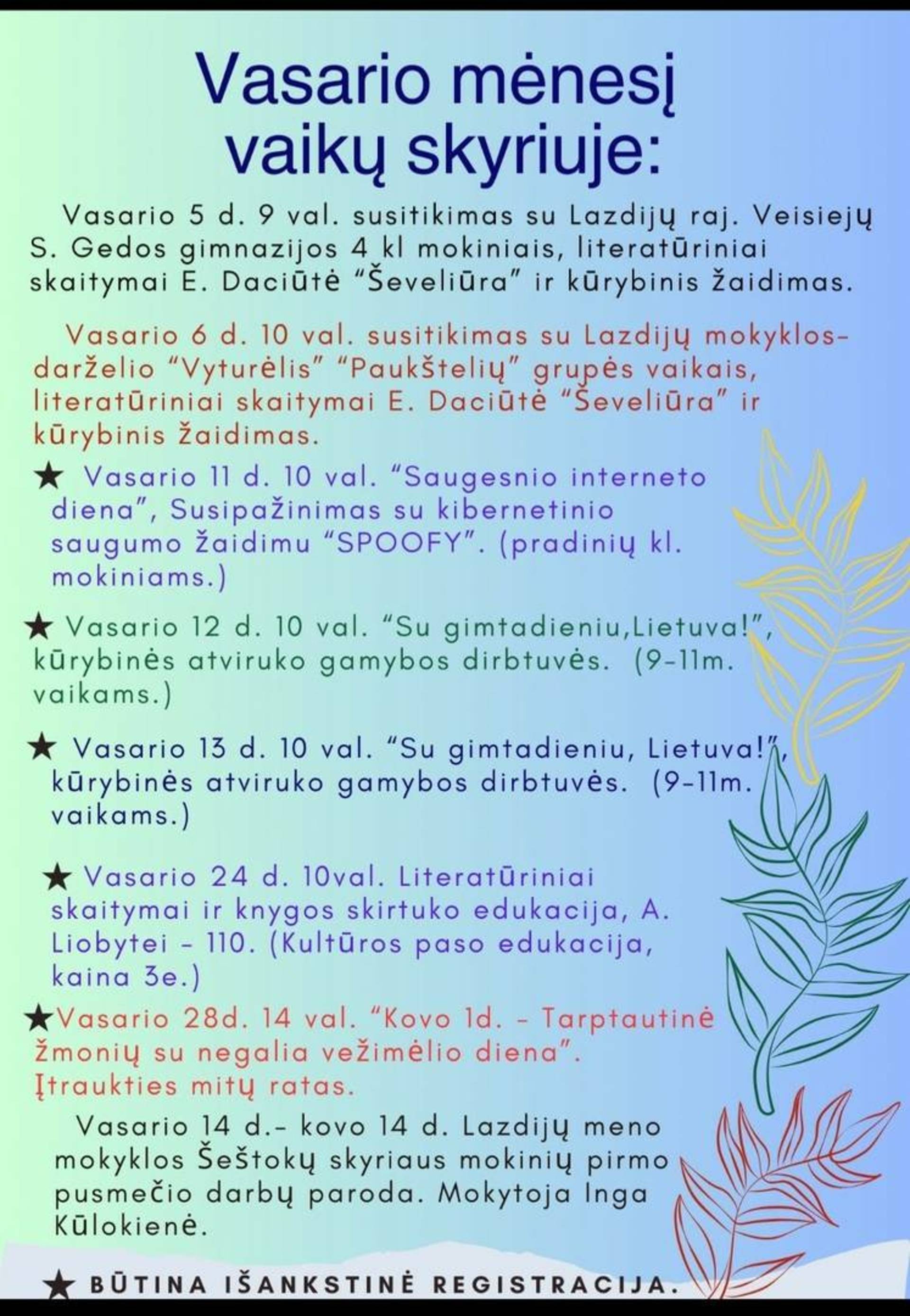 Spotkanie z powiatem Łoździeje Uczniowie czwartej klasy Gimnazjum Wiejsiejaja S. Gedy. Czytanie literackie E. Daciūtė „Ševeliūra” i zabawa twórcza. Wydarzenie odbędzie się w Oddziale Literatury Dziecięcej Biblioteki Publicznej w Łoździejach, ul. Seinų g. 1, rejon Łoździeje. niedziela