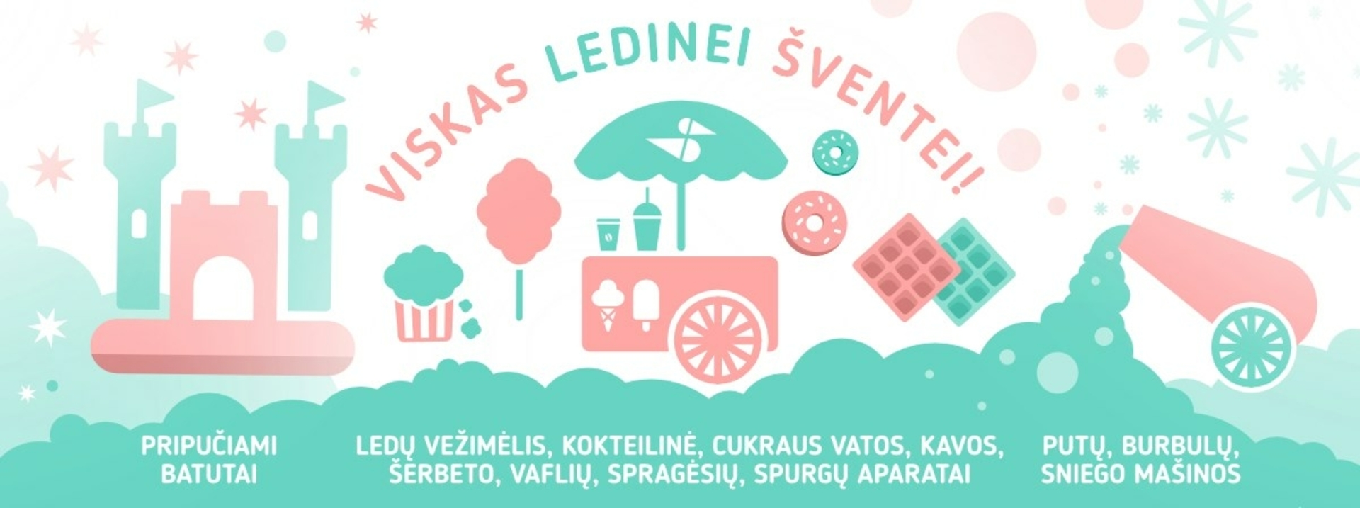 - Pridedama: vitrina su 3 skonių ledais (4 kg.), indeliai, pagardai.