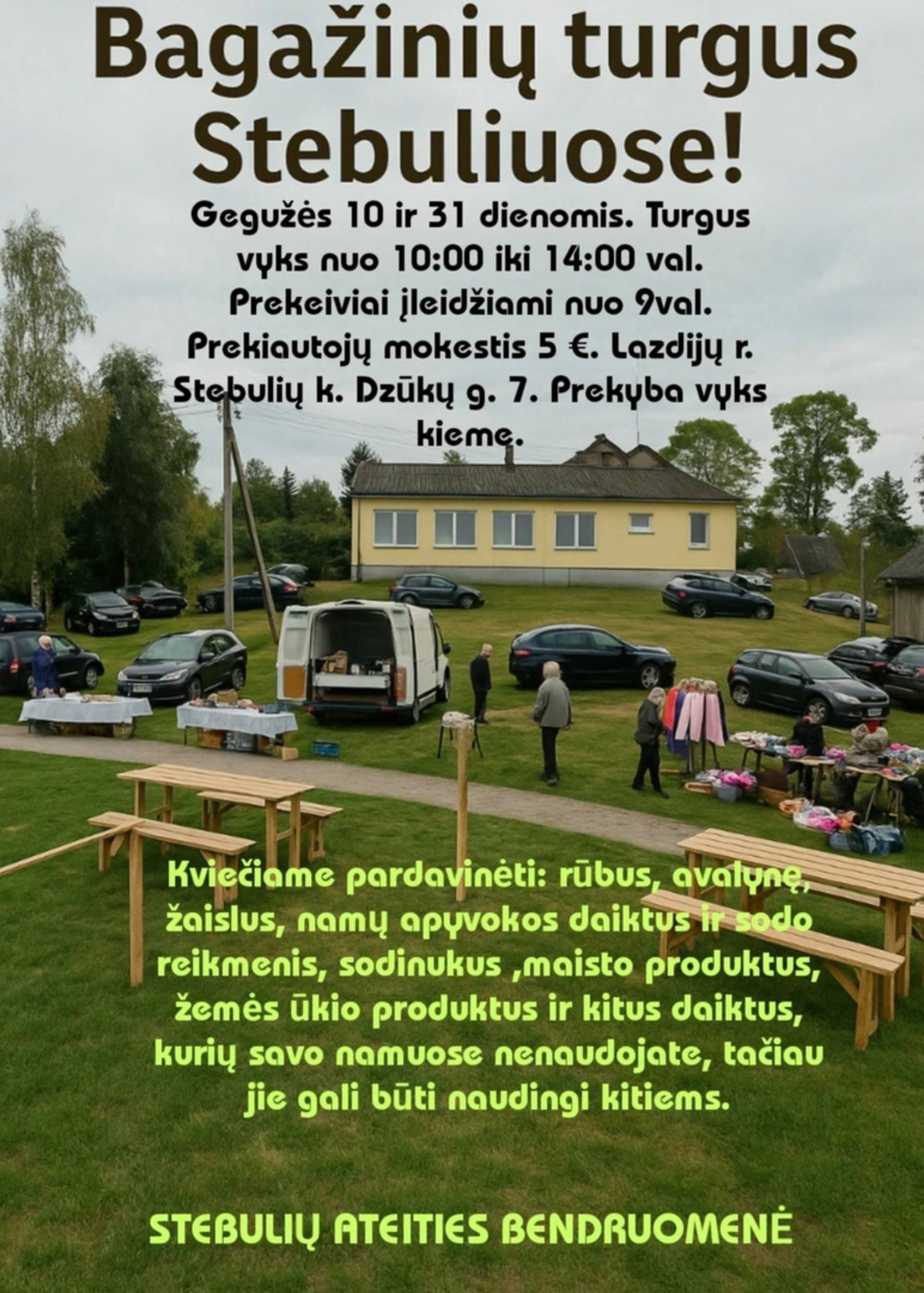 Bagažinių turgus Stebuliuose. Prekeiviai įleidžiami nuo 9 val. Prekiautojų mokestis 5 eur.