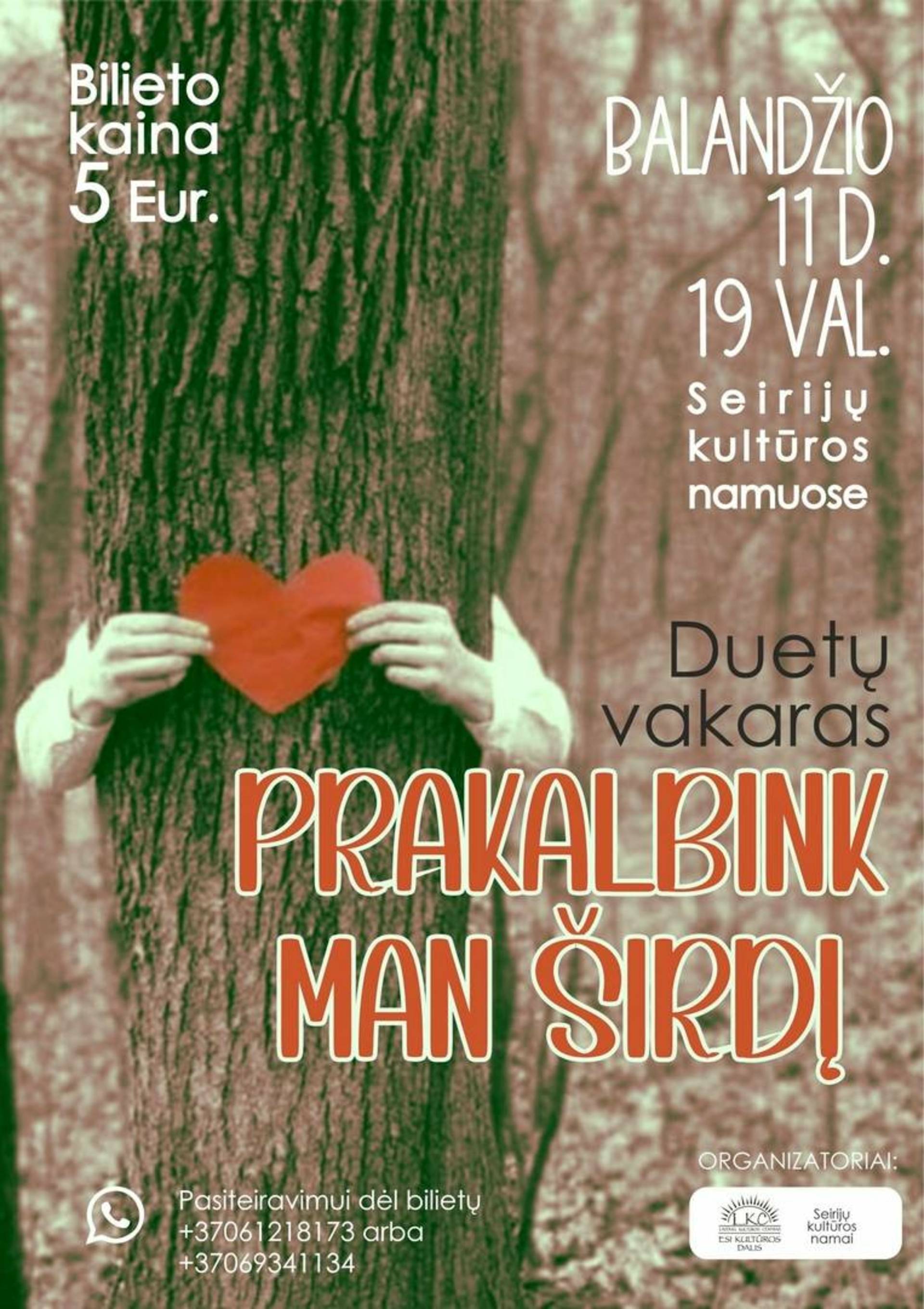 Kviečiame į tradiciniu tapusį, jaukų ir šiltą duetų vakarą. Bilietus galite įsigyti darbo dienomis Seirijų kultūros namuose, arba užsakyti, paskambinę telefonu.