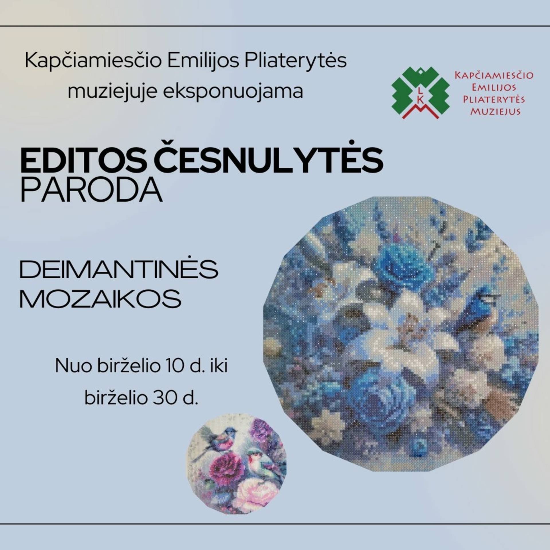 Kapčiamiesčio Emilijos Pliaterytės muziejuje eksponuojama EDITOS ČESNULYTES PARODA "DEIMANTINĖS MOZAIKOS". Nuo birželio 10 d. iki birželio 30 d.