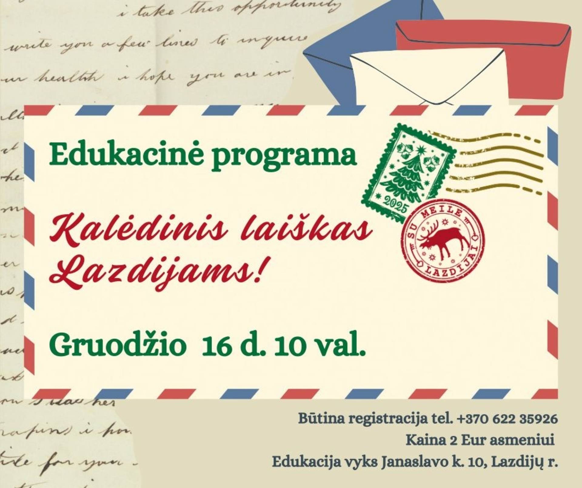 Prisijunkite ir sukurkime kalėdinį stebuklą kartu! Registracija būtina tel. +370 622 35926. Dalyvio mokestis 2 Eur. Edukacija vyks adresu Janaslavo k. 10, Lazdijai.