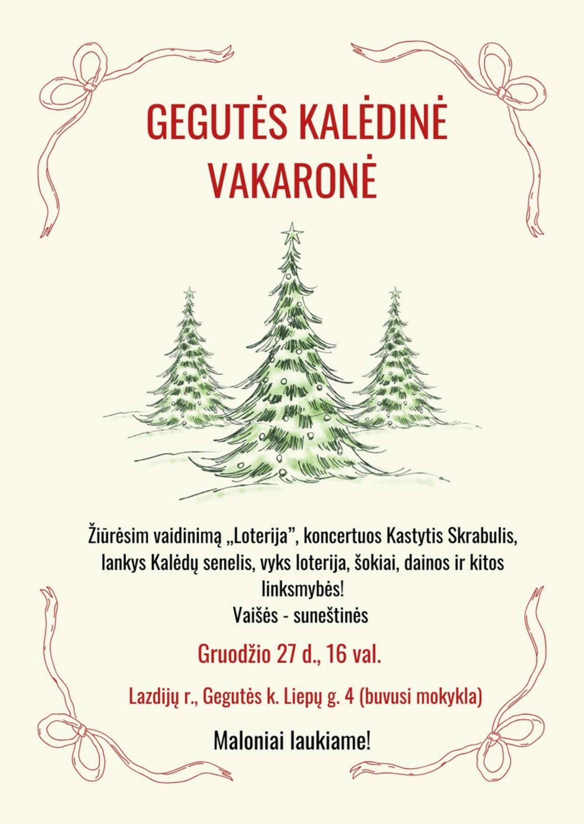 Žiūrėsim vaidinimą „Loterija”, koncertuos Kastytis Skrabulis, lankys Kalėdų senelis, vyks loterija, šokiai, dainos ir kitos linksmybės!