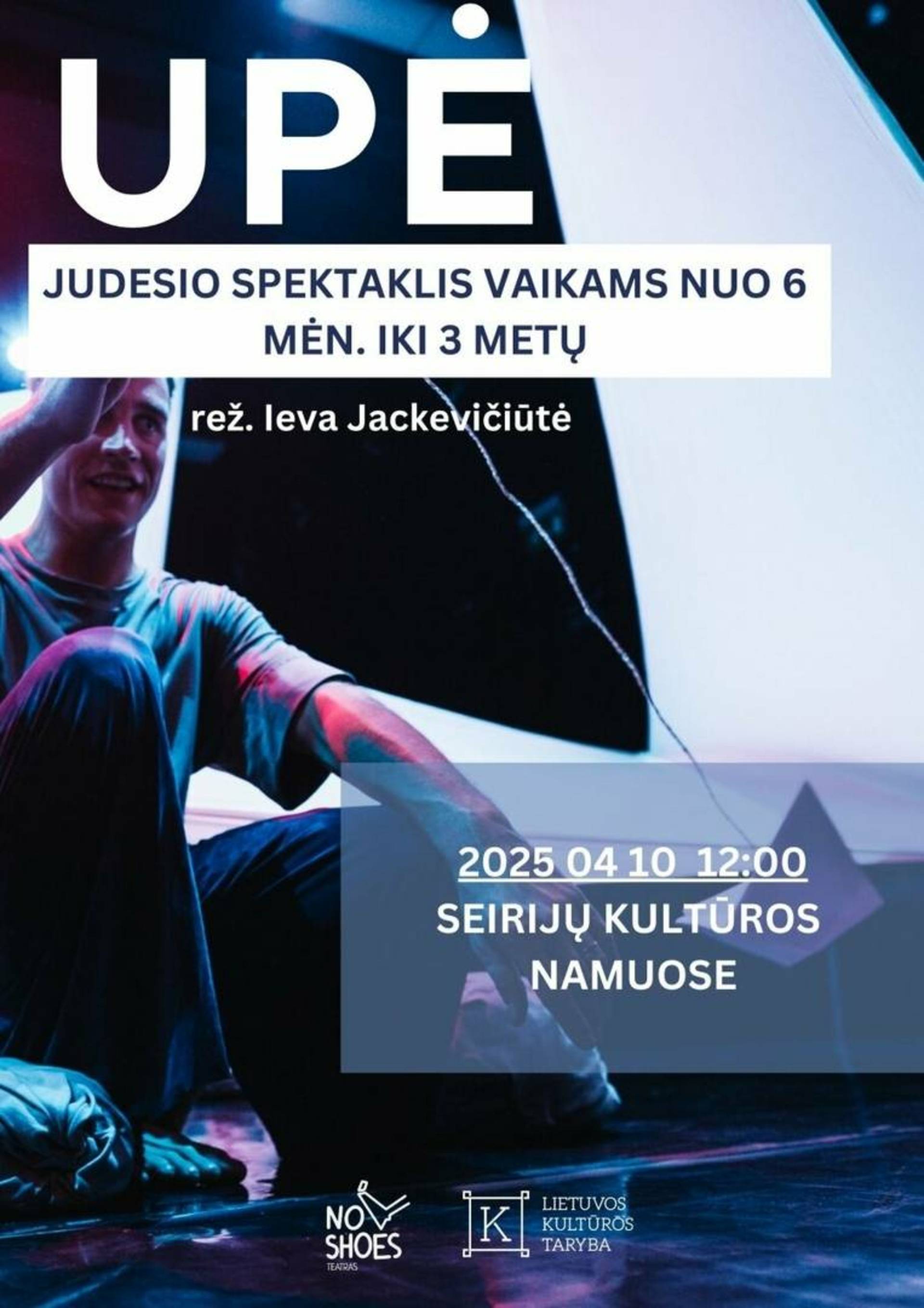 „No Shoes“ teatro judesio spektaklis UPĖ yra sukurtas atsižvelgiant į pačių mažiausių žiūrovų fizinius ir emocinius poreikius. Vaikai ne tik stebi šokėjų kūnus, judančius pagal klasikinės muzikos garsus, bet ir patys tampa interaktyvaus veiksmo dalyviais!