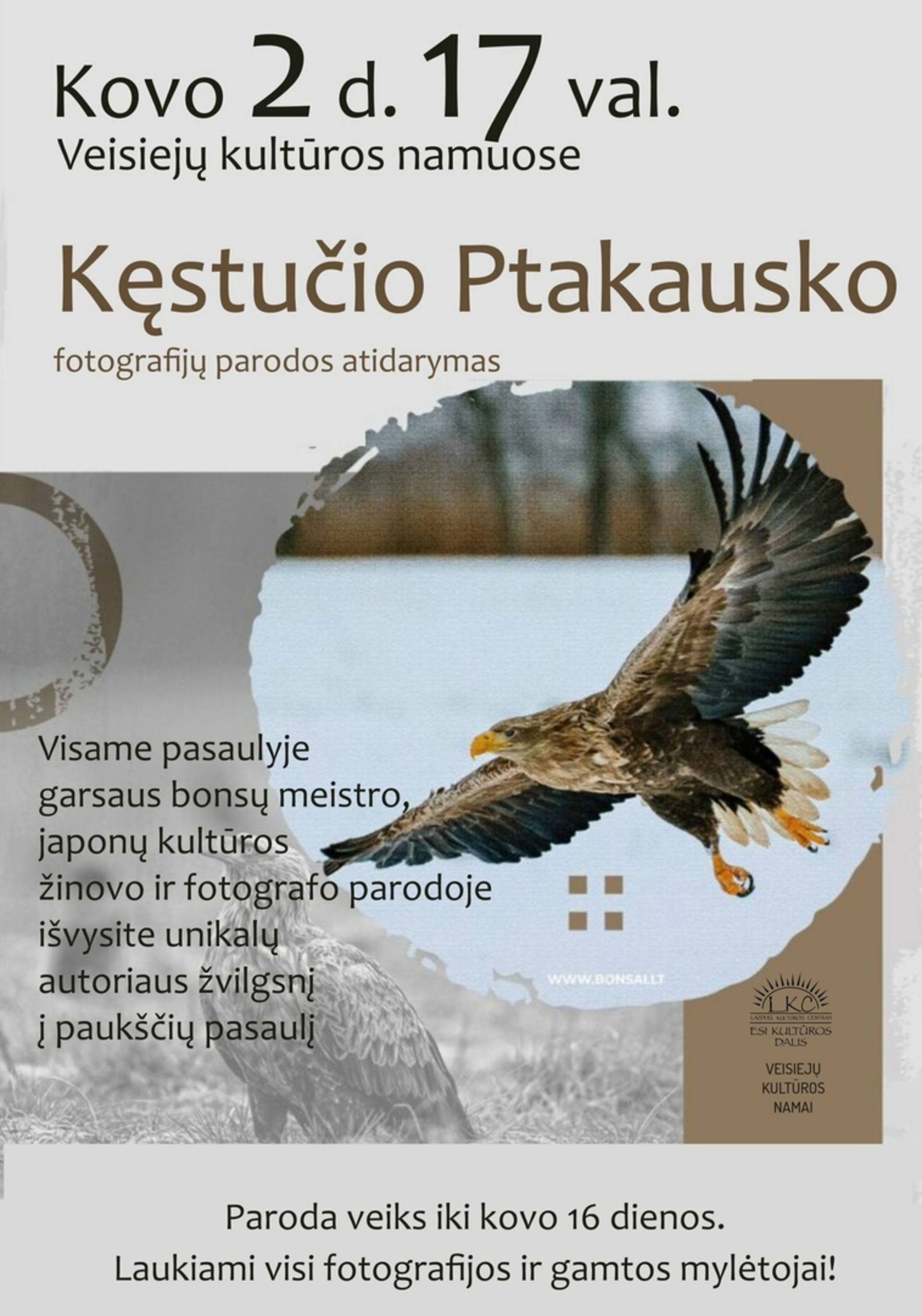Į Veisiejus atvyksta bonsų meistras ir fotografas Kęstutis Ptakauskas ir pristato fotografijų parodą, kurioje atsiskleidžia autoriaus jautrus ir unikalus žvilgsnis į gamtą. Nuotraukose tylūs peizažai, subtilios detalės ir akimirkos, kurias pastebi tik kantrus stebėtojas.