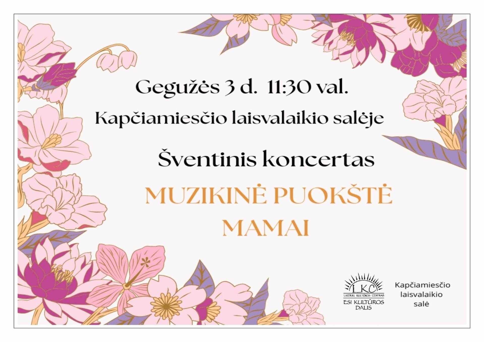 Maloniai kviečiame ateiti Mamytes, Mamas ir Močiutes su šeimomis pasidžiaugti Jums skirtu koncertu. Programoje: Kapčiamiesčio l. s. saviveiklininkai, Veisiejų TAU linijinių šokių grupė SVAJA ir Kapela ŠPOKAS