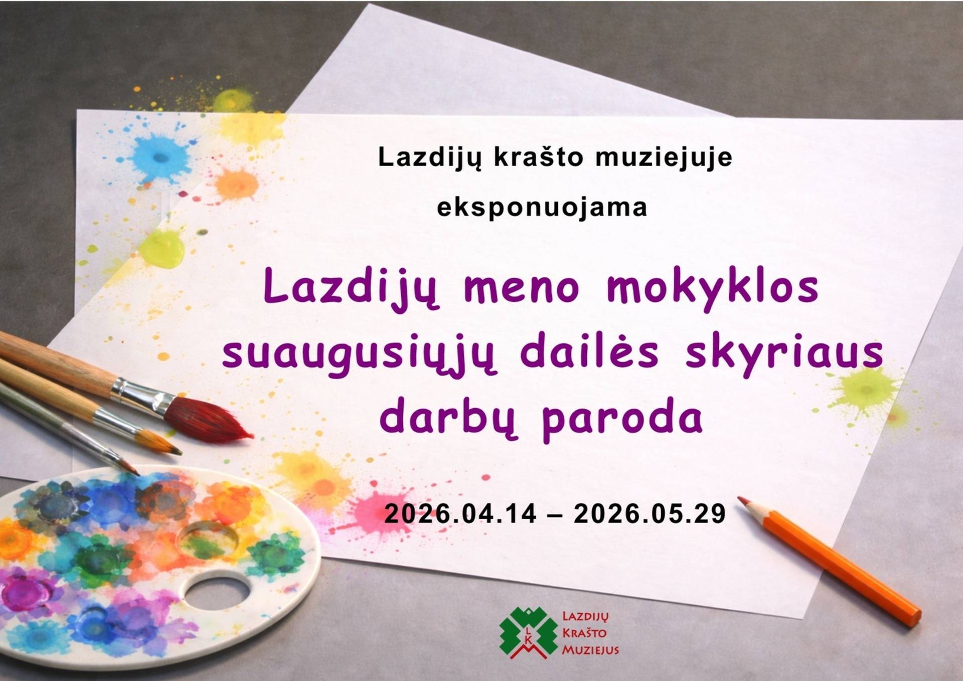 Lazdijų krašto muziejuje balandžio 14 d. 17.15 val. vyks Lazdijų meno mokyklos suaugusiųjų dailės darbų parodos atidarymas – jauki ir nuoširdi kūrybos šventė, kurioje kiekvienas eksponuojamas kūrinys papasakos savitą istoriją. Čia rasite spalvų drąsą, rankų šilumą ir tikrą, nesuvaidintą kūrybos džiaugsmą.