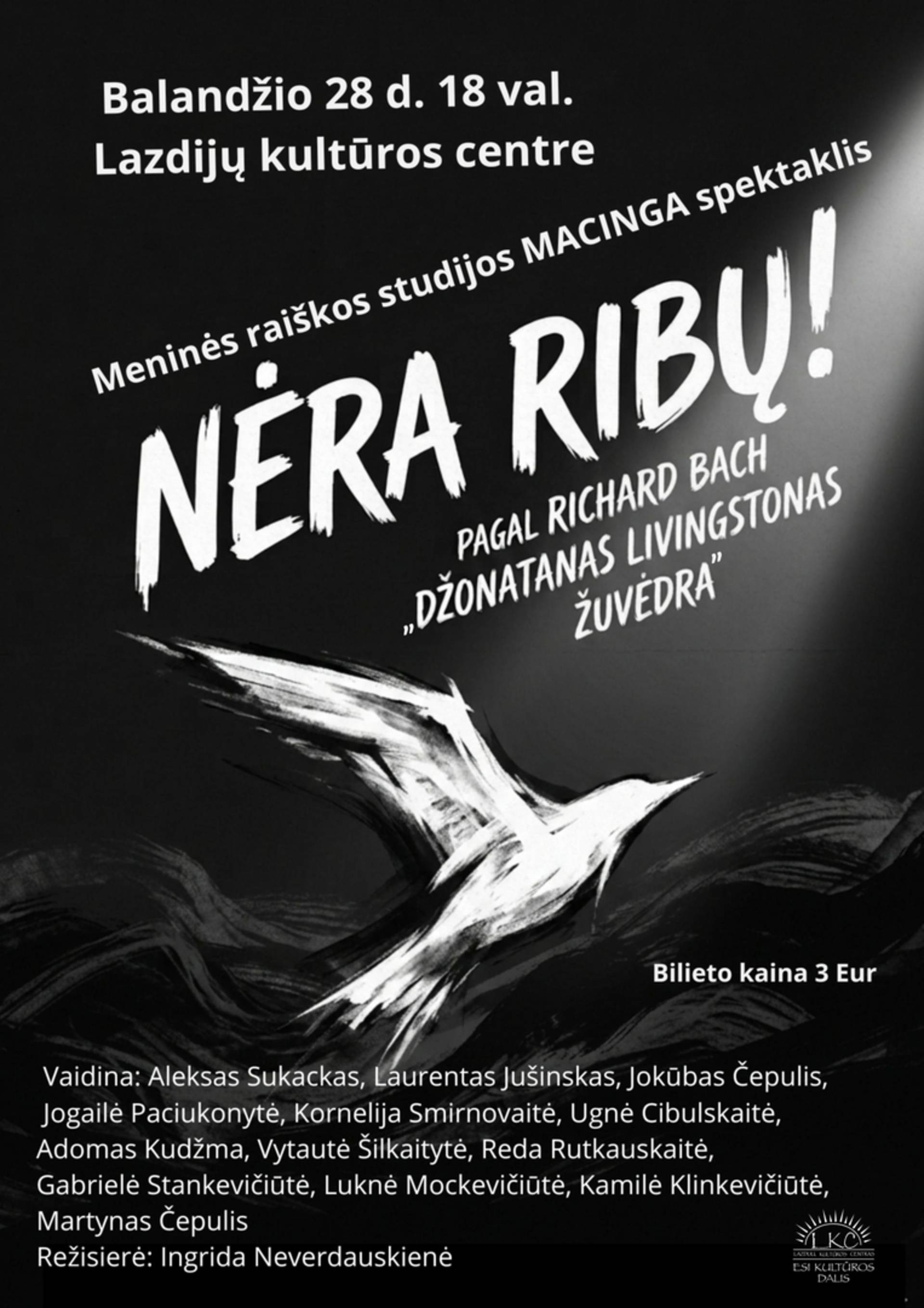 Meninės raiškos studijos „Macinga“ spektaklis „Nėra ribų“, pagal Richard Bach knygą „Džonatanas Livingstonas žuvėdra“. Premjera – balandžio 28 d. 18 val. Lazdijų kultūros centre.