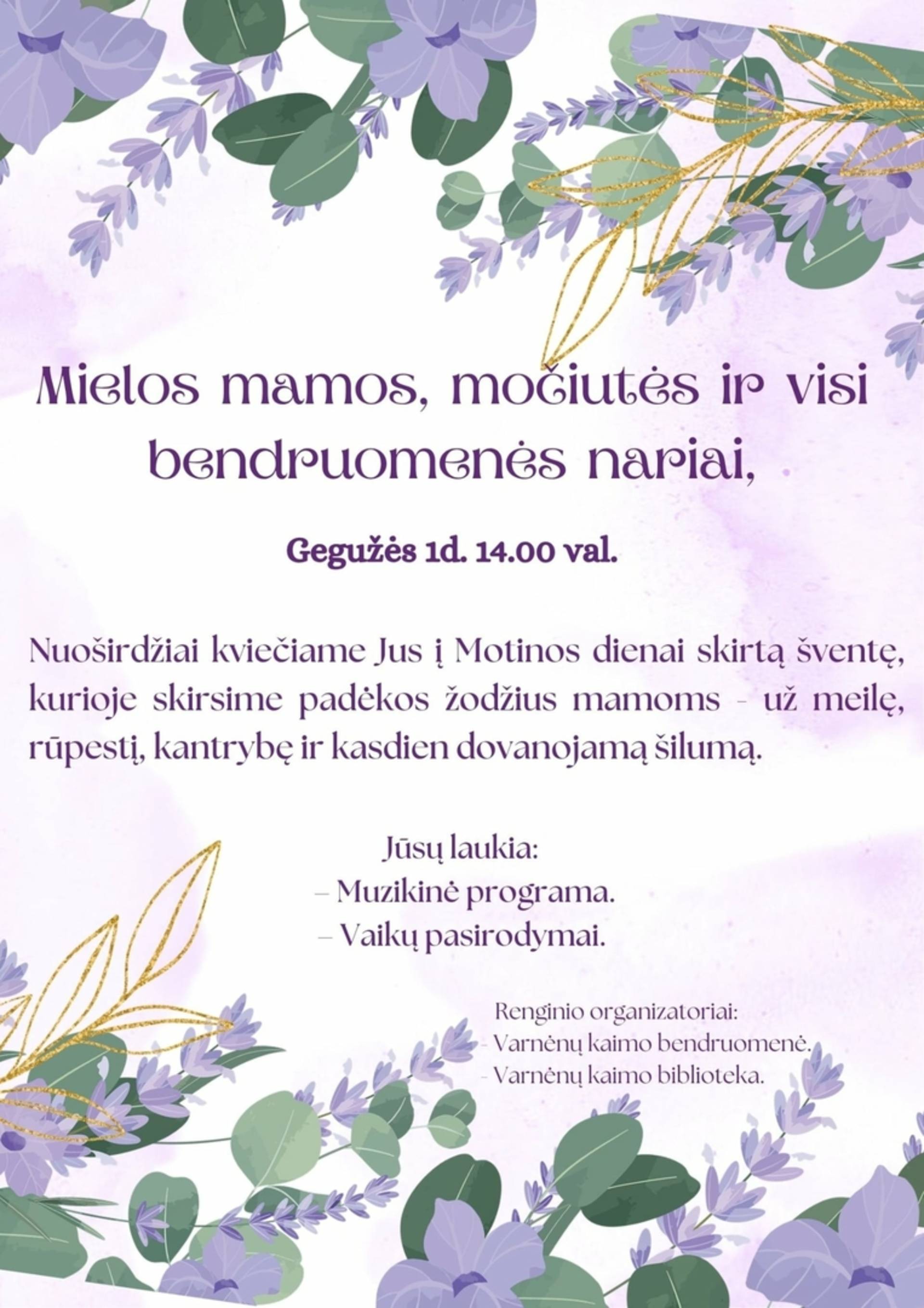 Gegužės 1d. 14.00 val. Nuoširdžiai kviečiame Jus į Motinos dienai skirtą šventę, kurioje skirsime padėkos žodžius mamoms - už meilę, rūpestį, kantrybę ir kasdien dovanojamą šilumą.