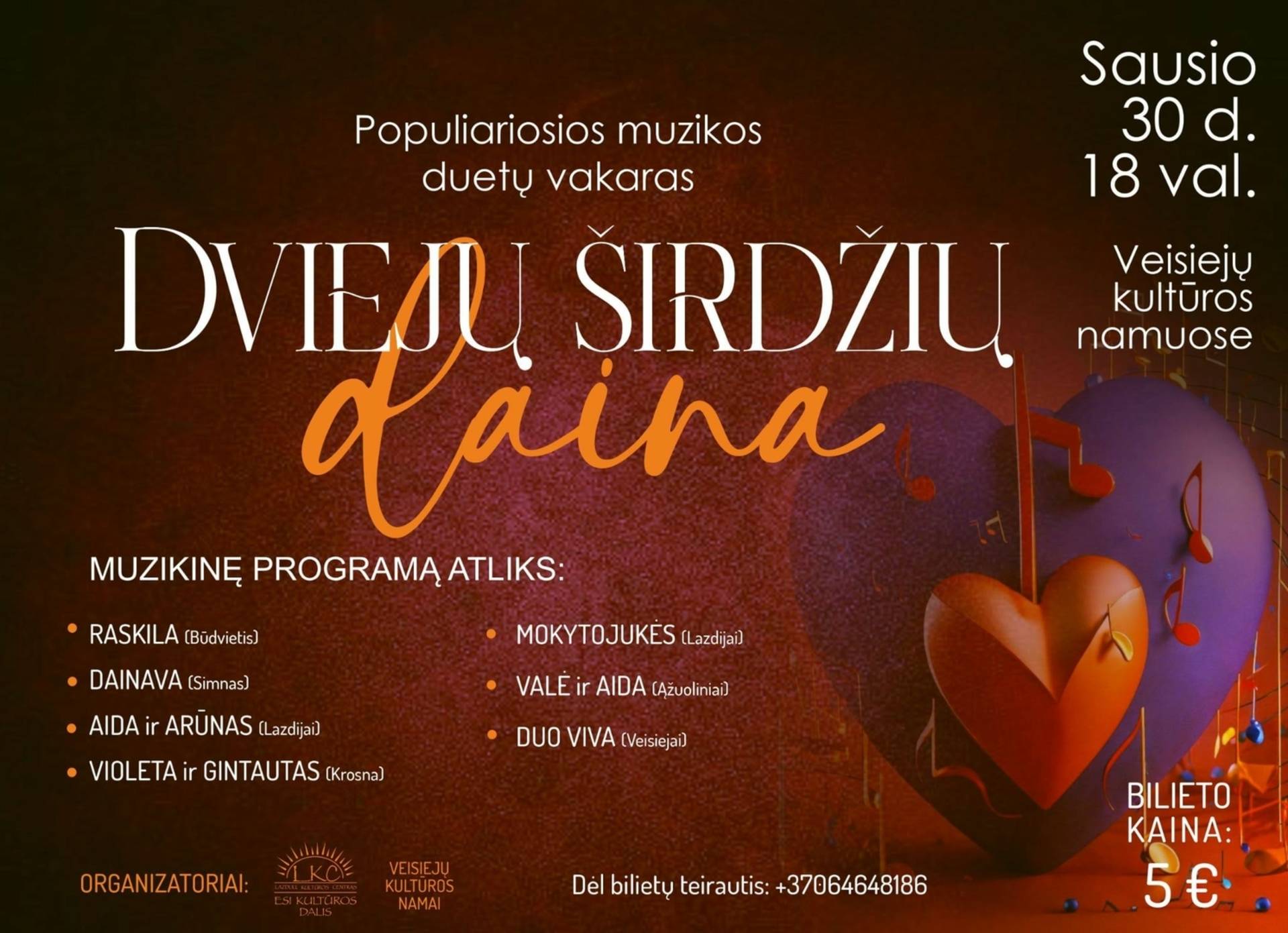 Kviečiame į romantišką ir jaukų muzikos vakarą „Dviejų širdžių daina“!