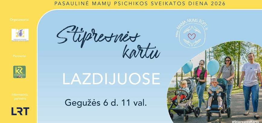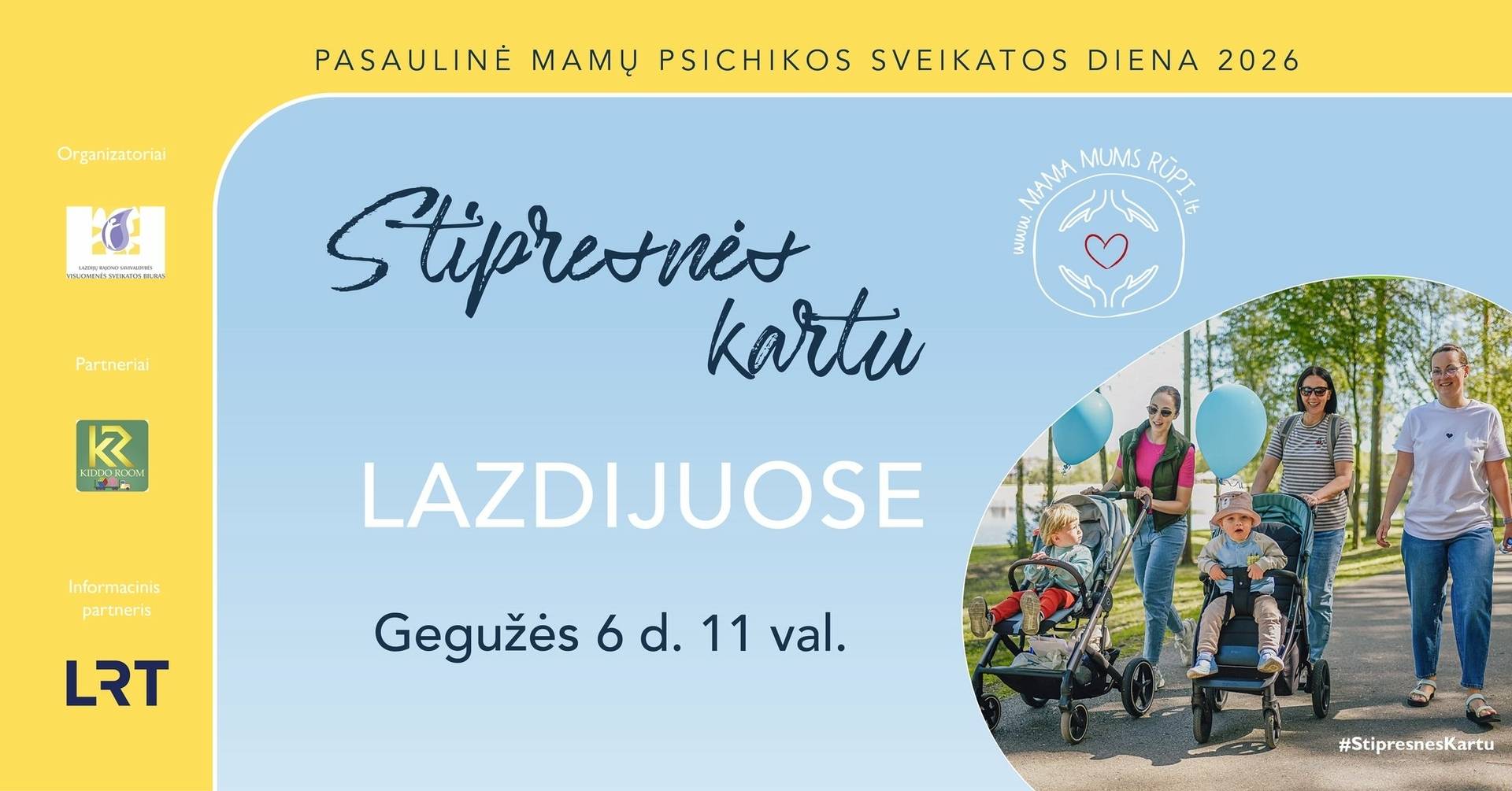 Mamos kartais eina. Kartais – bėga. Dažnai pavargsta. Bet kasdien vėl keliasi ir eina paskui savo vaikus. Motinystė – tai visas emocijų spektras, kuriame telpa ne tik džiaugsmas, bet ir nuovargis, nerimas, liūdesys ar perdegimas. Šiemet Pasaulinę mamų psichikos sveikatos dieną Lietuvoje minime jau ketvirtą kartą, kviesdami į pasivaikščiojimus „Stipresnės kartu“, kurie vyks daugiau nei 30 Lietuvos miestų. Tai paprastas susitikimas ir pasivaikščiojimas, skirtas pabūti kartu – su kitomis mamomis, šeimomis ir žmonėmis, kuriems rūpi mamų emocinė sveikata. Tai nėra sporto renginys – eisime ramiu tempu, su vežimėliais, su vaikais ar tiesiog savo žingsniu.