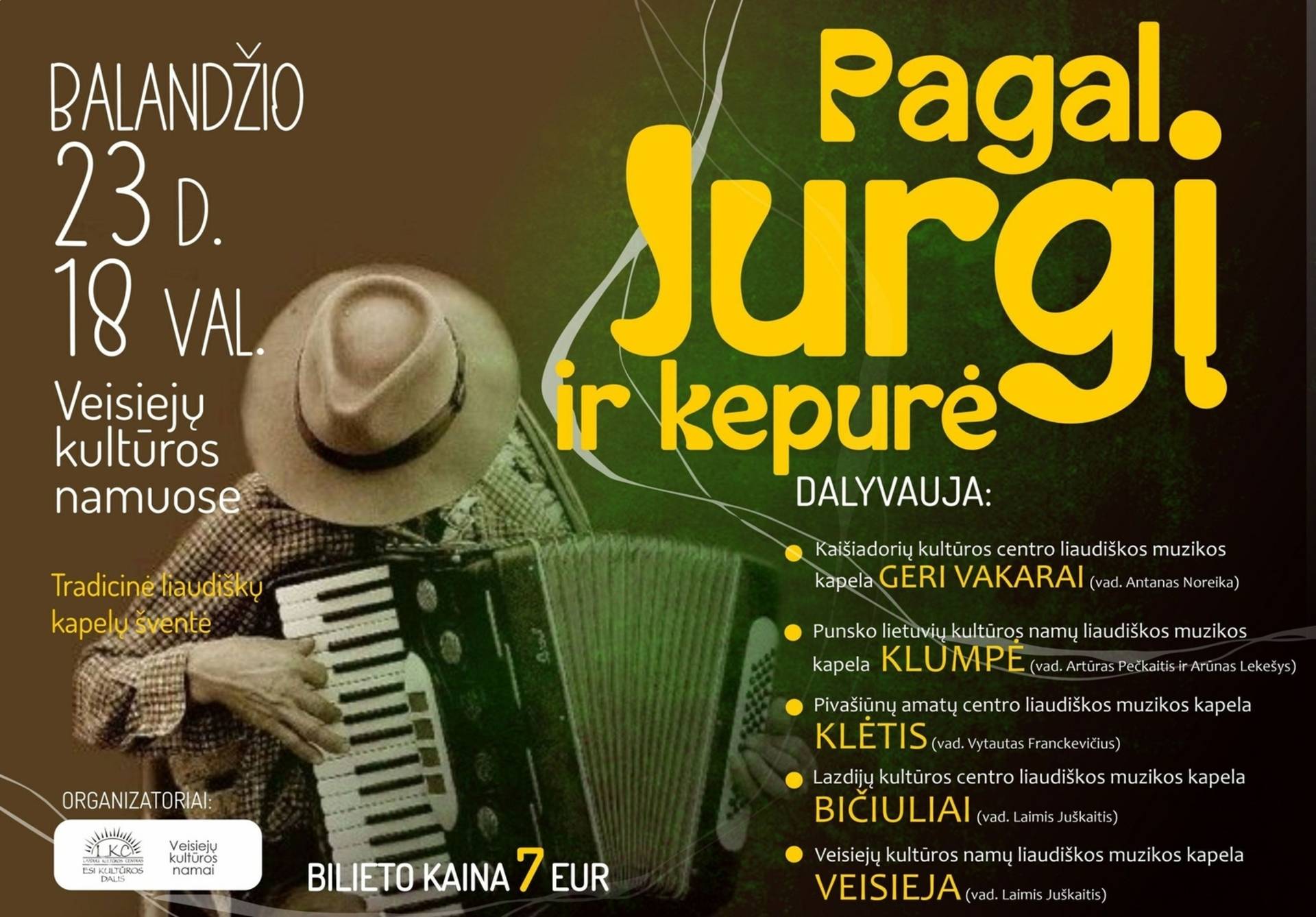 Balandzio 23 d. 18 val. Veisiejų kultūros namuos bus cikra šventė – jau tradicini tapus kapelų šventė „Pagal Jurgį ir kepurė“! Kap sugraudės, suskambės kapelų muzika, kojos pacios šokc prašysis!