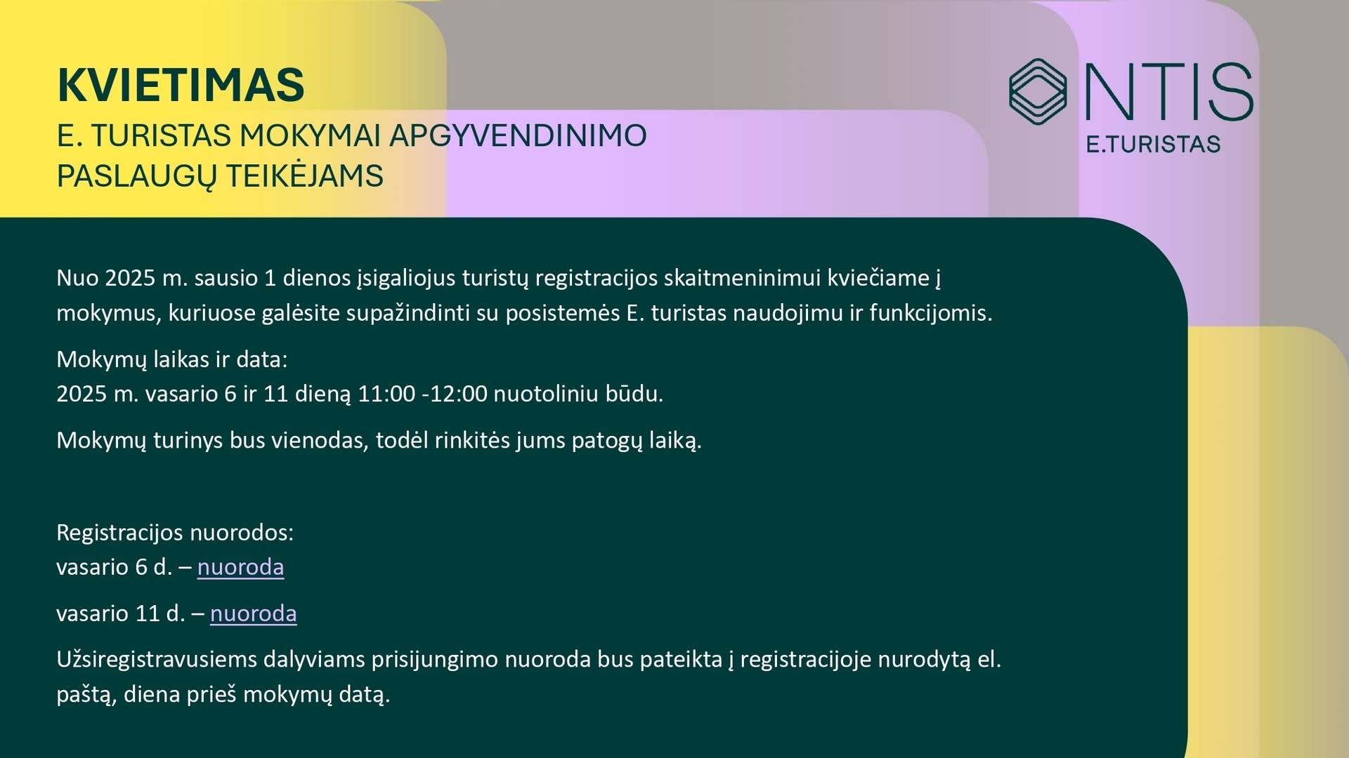 С 2025 года В связи с цифровизацией регистрации туристов, вступающей в силу с 1 января, Государственное учреждение «Путешествие в Литву» приглашает вас на обучение, где вы сможете ознакомиться с использованием и функциями подсистемы E. Turista.