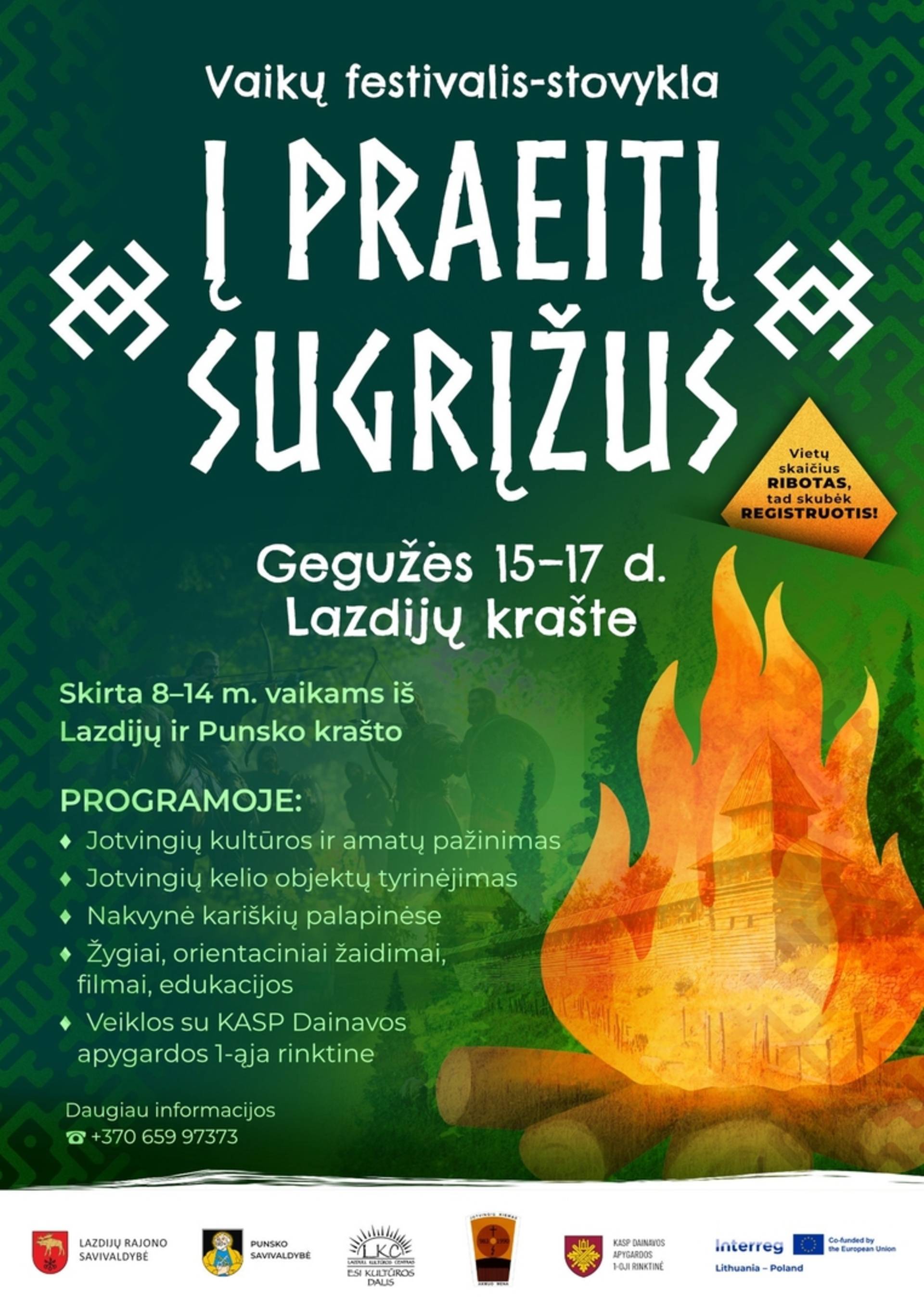 Приглашаем детей 8-14 лет. Дети из регионов Лаздияй и Пунскас примут участие в лагере, в рамках которого пройдут йотвягские мероприятия, походы, игры по ориентированию, образовательные и другие мероприятия с основателем «Jotvingių kiemas» и первой командой KASP округа Дайнава.