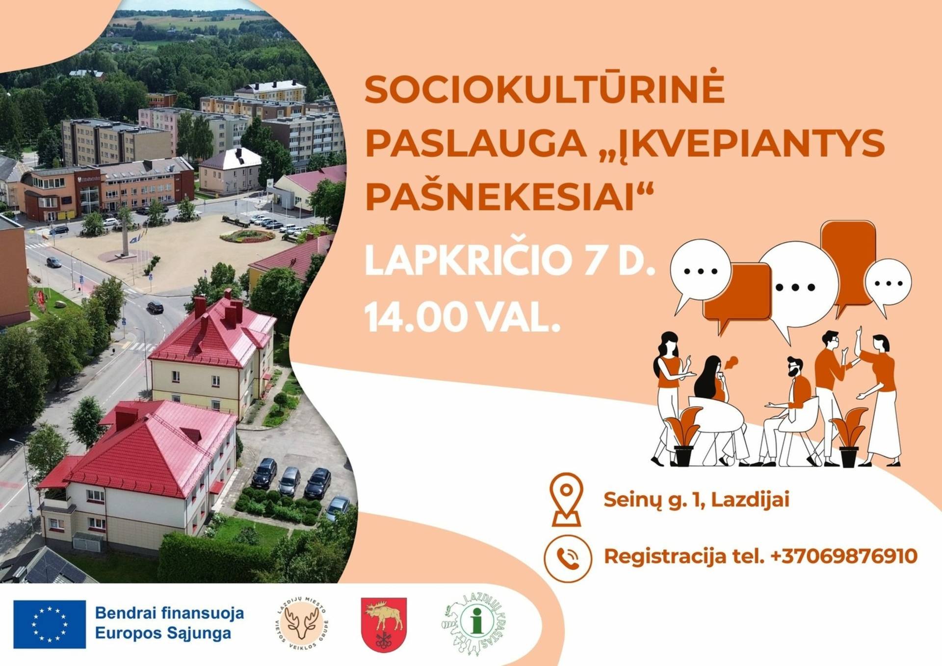 7 ноября в 14:00 приглашаем вас принять участие в социокультурной акции «Вдохновляющие беседы» в рамках проекта «Предоставление социально-культурных услуг в городе Лаздияй». Целью встречи станет создание социальных связей, которые будут мотивировать, развивать личностные и психологические способности, а также вдохновлять на рост. В мероприятии примет участие режиссёр и ведущий телевизионных программ, музыкальных проектов и сценарист Витянис Паулюкайтис.