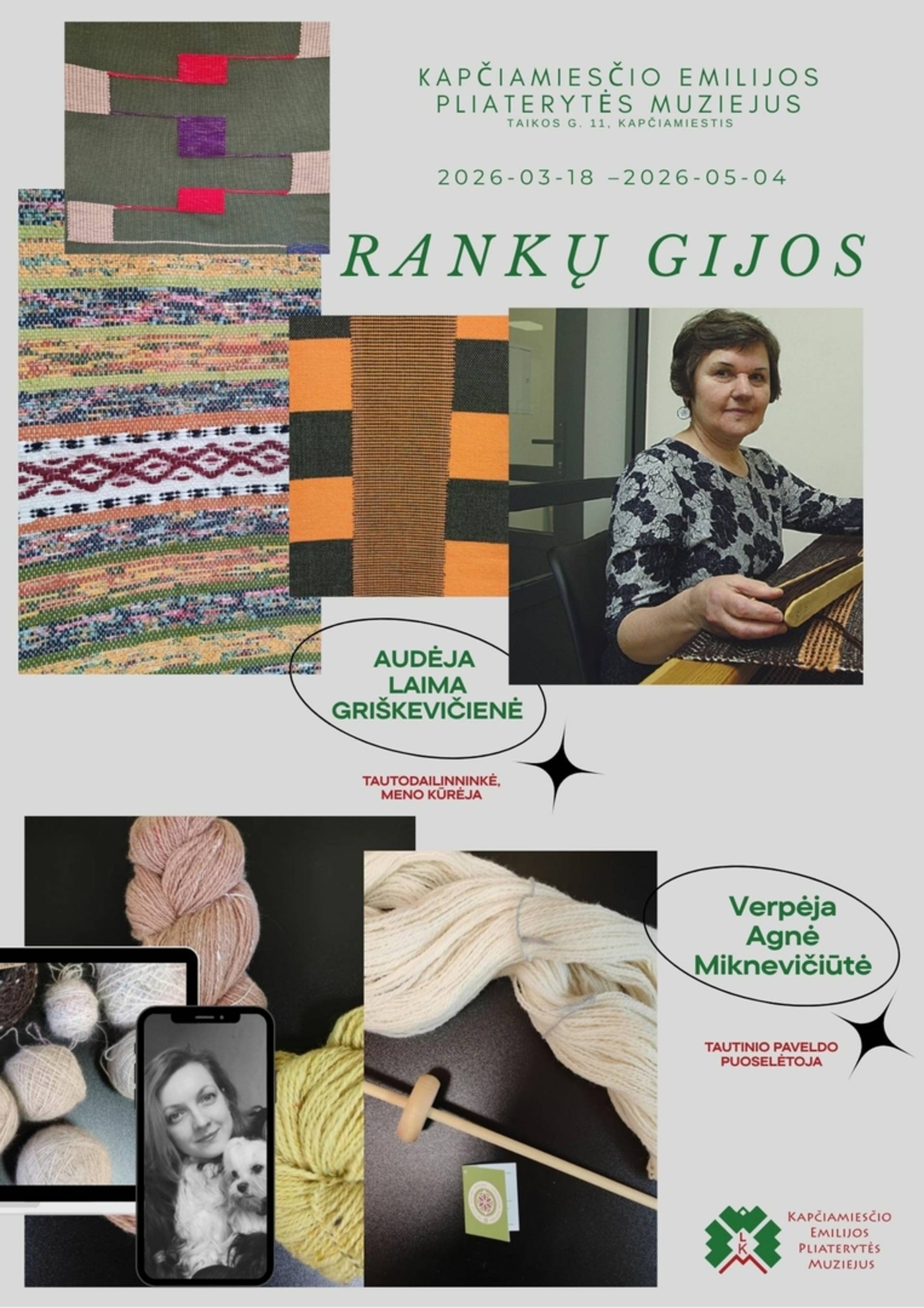 Музей имени Эмилии Плиатерите в Капчиамиестисе приглашает вас на уютную, согревающую руки совместную выставку «Ручные нити», которая объединяет двух хранительниц культурного наследия — ткачиху Лайму Гришкевичене и прядильщицу Агне Микневичюте. Это не просто выставка, а история о времени, терпении и живых традициях, вплетенных в каждую нить.